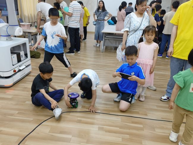 自动沿着线条行驶的小车吸引了小朋友们的注意。他们好奇地观察小车如何沿着黑色线条穿梭前行,并在志愿者的耐心解释下,了解了小车的工作原理。孩子们还尝试自己操控小车,通过亲身体验,增强了对科学原理的理解和兴趣。
