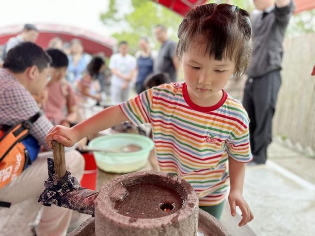 在三十六行非遗文化馆,大朋友、小朋友们一同体验制磨豆浆、做崇明米糕,与米香相伴,慢享春之韵律。
