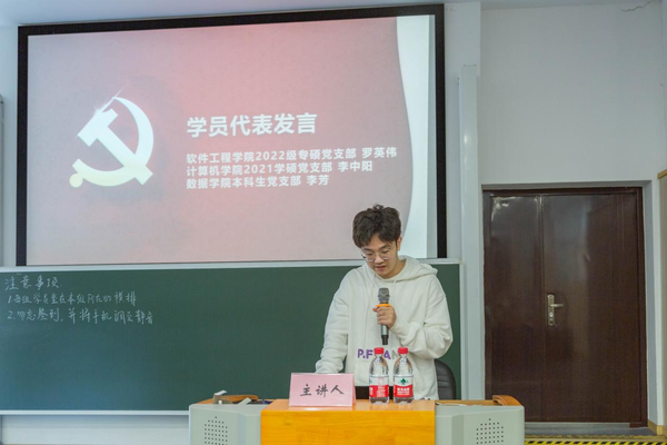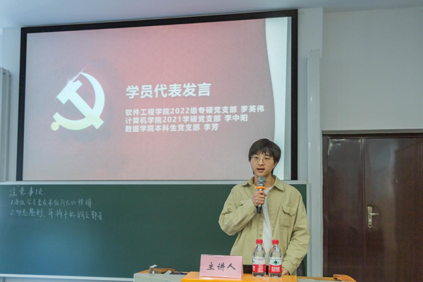软件学院2022级专硕党支部罗英伟、计算机学院2021学硕党支部李中阳、数据学院本科生党支部李芳作为学员代表发言。三位同学从自身经历出发,分享了自己的入党动机,表达了身为入党积极分子的觉悟和信念,并表达了对此次积极分子培训的期待,希望能通过此次学习,对中国共产党有更理性、全面、清晰的认识,以实际行动向党组织靠拢。