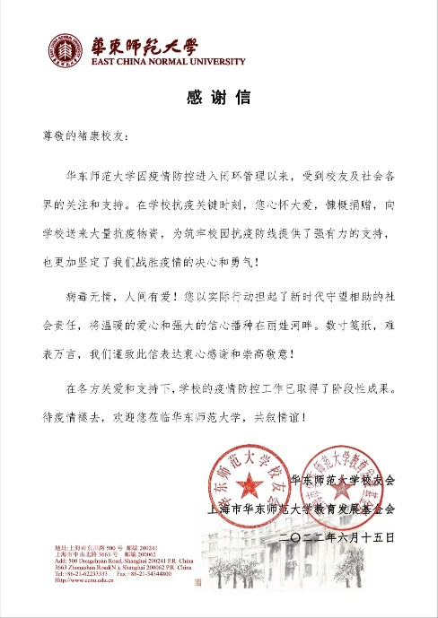 2022年3月,上海多区疫情告急,学校加强封控管理。在学校抗疫关键时刻,bat365中文官网入口毕业生张逸中和褚康,积极与学校联系,分别为365官网捐赠了食品、生活用品等重要抗疫物资,助力母校抗击疫情。bat365在线平台官网校友会及教育发展基金会为两位校友颁发了感谢信。
