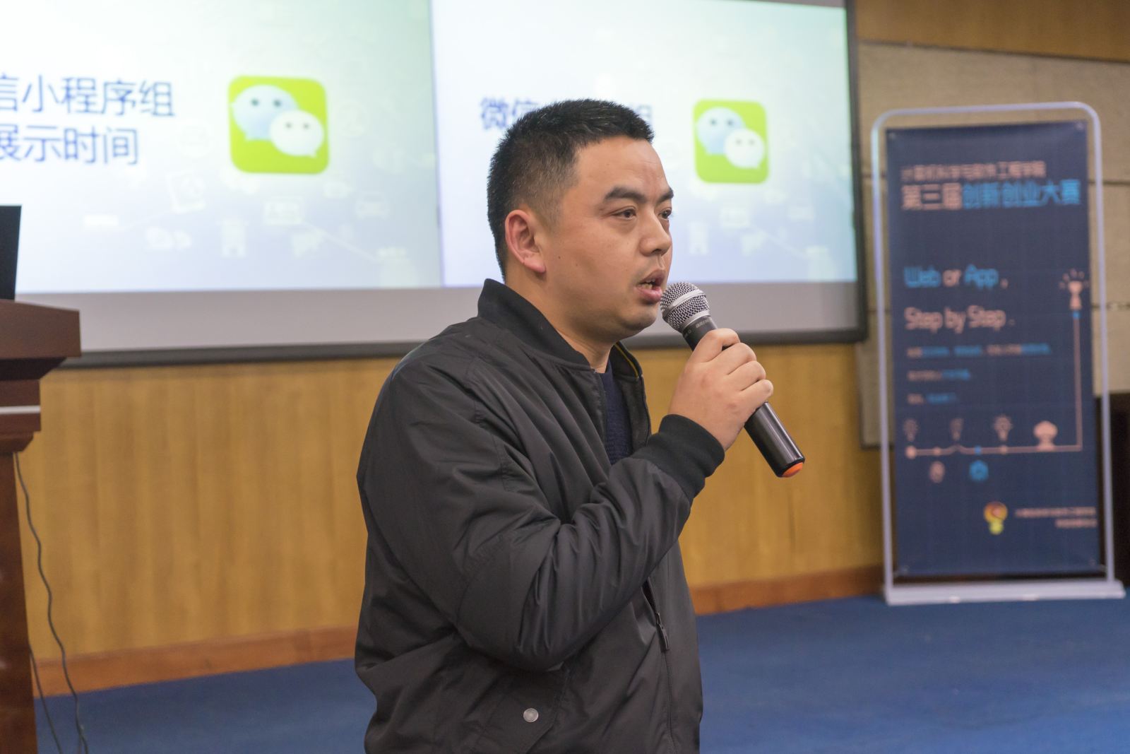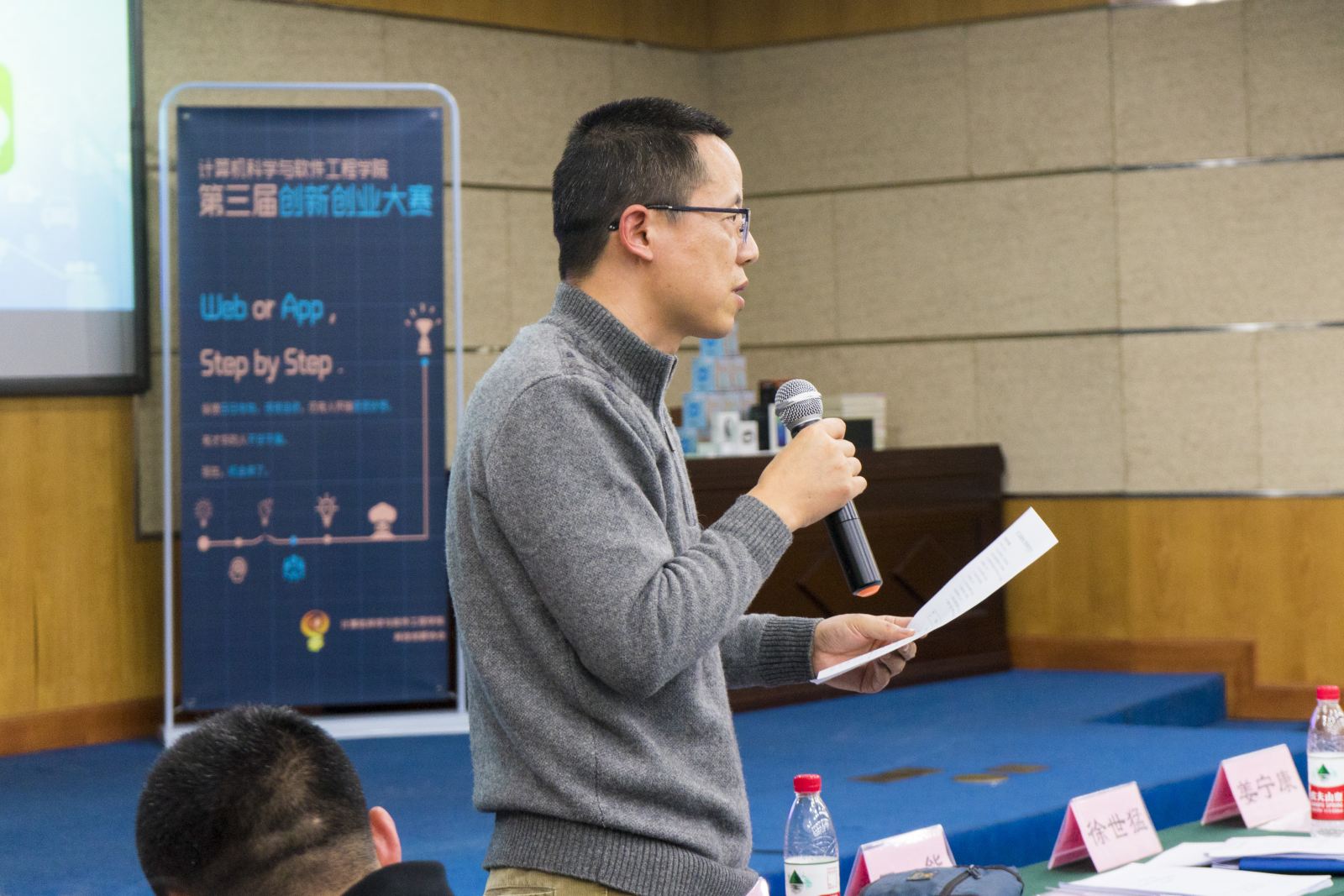 冬意渐浓,天气渐寒,却依然阻挡不了计软学子对于创新创业的渴望与热忱。12月27日下午,科创达人云集理科大楼A504,上演了一场别样的风采展示——计算机科学与bat365中文官网入口第三届创新创业大赛决赛在这里举行。365官网教务处副处长徐世猛、校团委书记刘麒、就业创业服务中心曹旭,我院党委副书记兼副院长洪燕、副院长姜宁康等领导莅临比赛现场,华师大终生教授王能、游族网络新番工作室技术总监金刚以及来自学院各系的多位老师担任比赛评委。