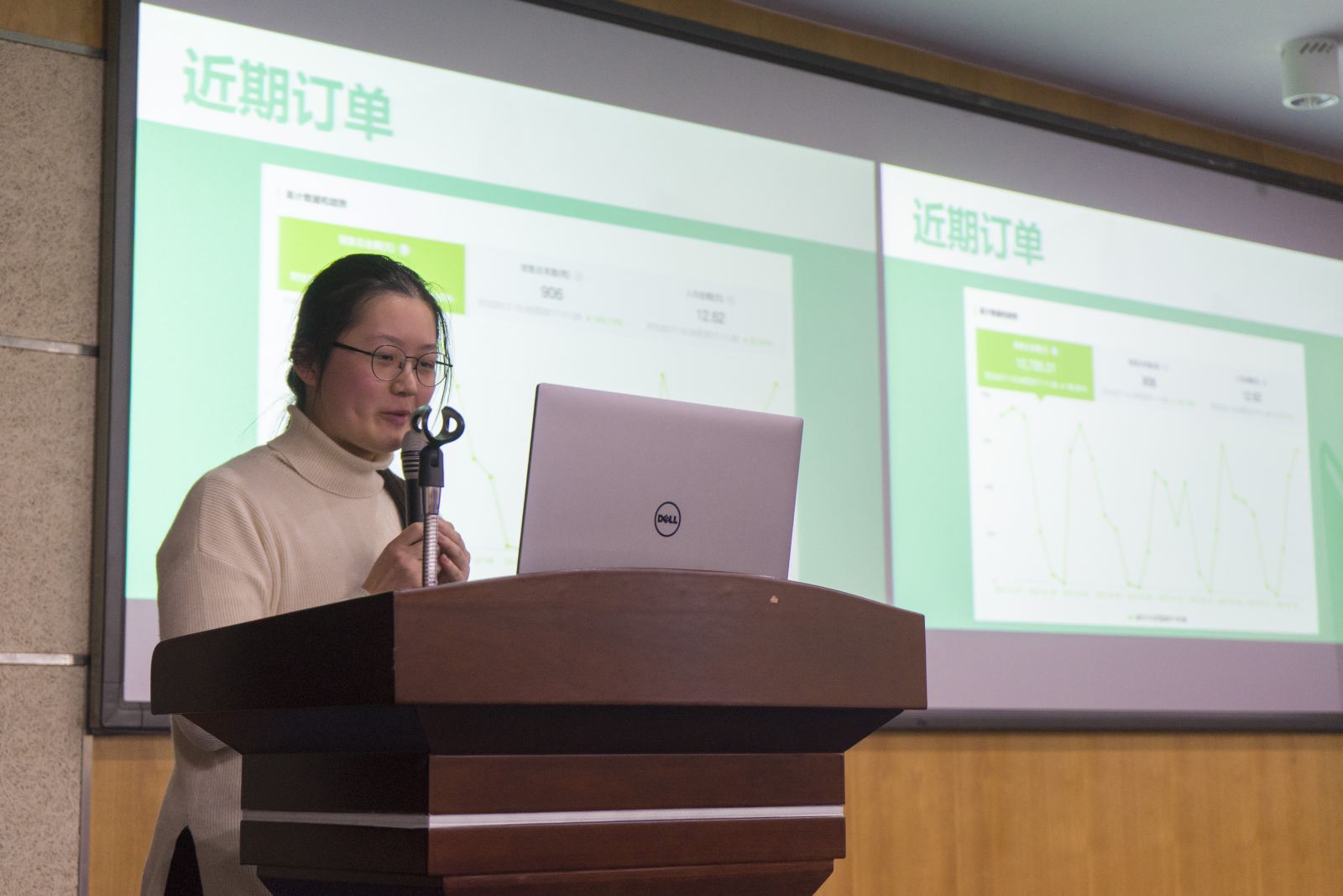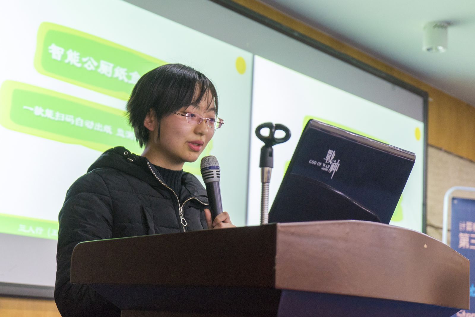 最后是此次创新创业大赛的新增项目组——微信小程序组的比赛。 “智能公厕纸盒机系统”旨在节约用纸,开发了一套公厕取纸机,用户通过手机客户端扫码支付,装置根据支付额给出所需纸量,同时装置具有监测预警功能,及时给工作人员手机发送提醒补纸信息。独具创意的项目赢得了全场的掌声,荣获冠军。张民老师对微信小程序组作品作了精彩点评,建议同学们要有更为疯狂和大胆的创意。