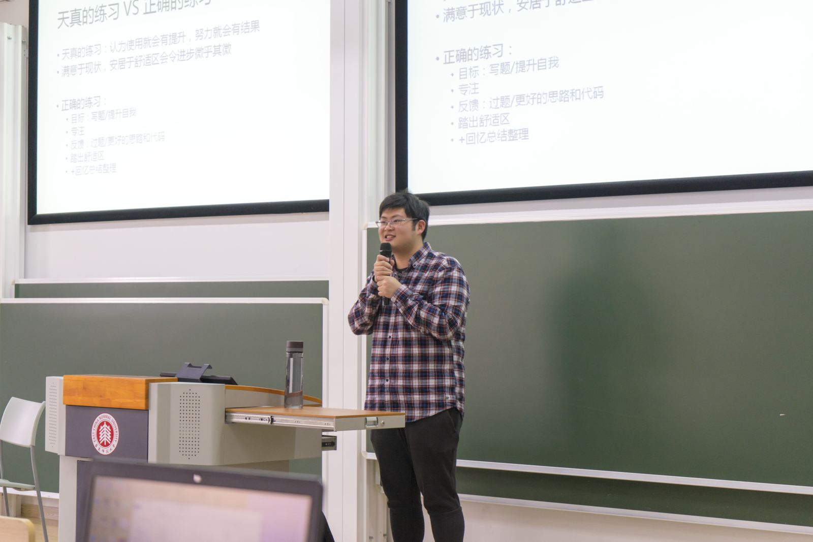 17级本科生陈宇琪同学从调试程序的角度,与同学们做了分享了他的经验。他强调了深入分析数据、理解数据是如何而来的重要性,建议同学们通过输出中间变量的方式明晰程序如何运行。此外,他还介绍了相对效率高的断点调试法和函数调试法。在编程技巧方面,结合本次考试题目,他建议同学们要多测试数据、特别是测试极端数据,然后估计时间复杂度,平时也要注重培养自己的编程兴趣,通过认真阅读题目、命名特殊意义的变量名、理清思路以养成良好的做题方法。