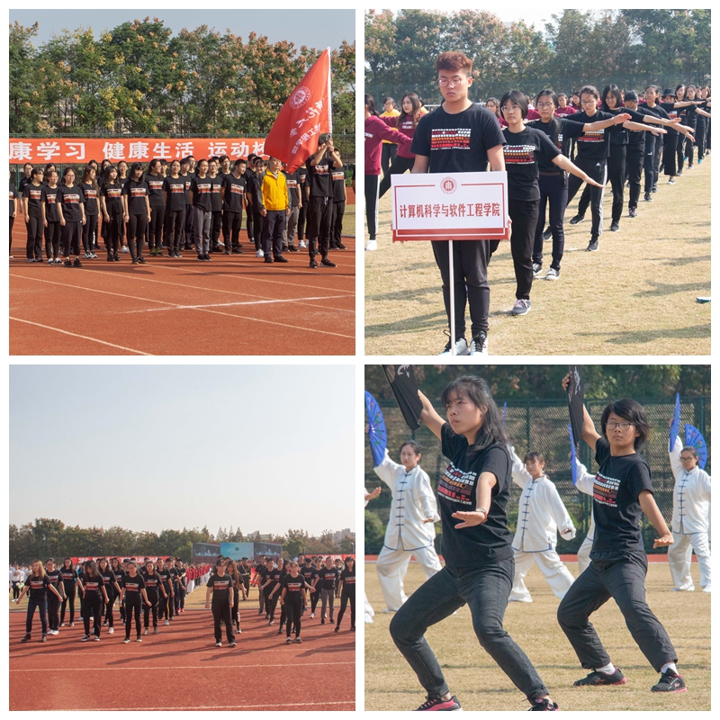 开幕式上,学院36名同学组成的方队统一身着院服,迈着整齐的步伐进入会场,在主席台前为全校师生表演了精心准备的方阵舞。在随后进行的广播操和功夫扇比赛中,同学们热情饱满、精神抖擞,展现出了计软学子的青春风貌,赢得了在场观众的掌声。