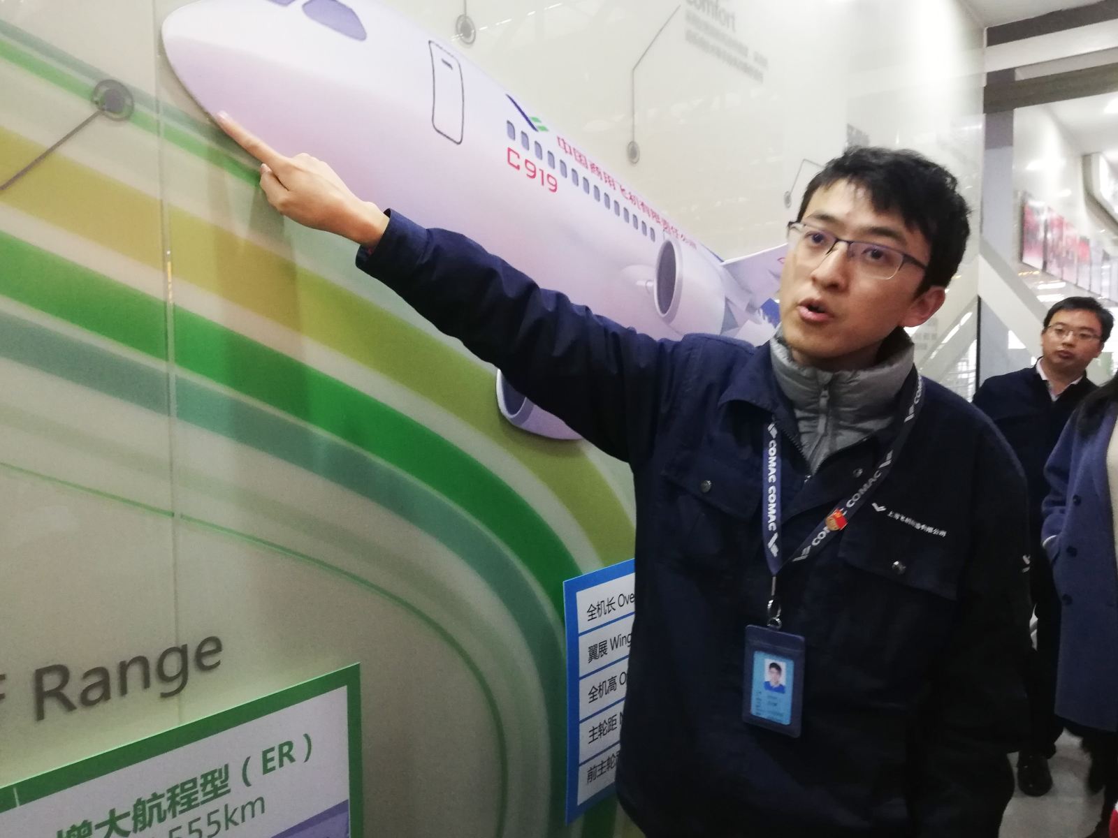 大家跟随工作人员参观C919总装生产线。首先映入大家眼帘的是一面巨大的五星红旗和“长期奋斗,长期攻关,长期吃苦,长期奉献”几个大字。工作人员向大家具体介绍商飞的历史、大型客机C919、支线客机ARJ21、企业文化、人才队伍、未来发展规划等情况,同学们认真聆听,收获颇多。
