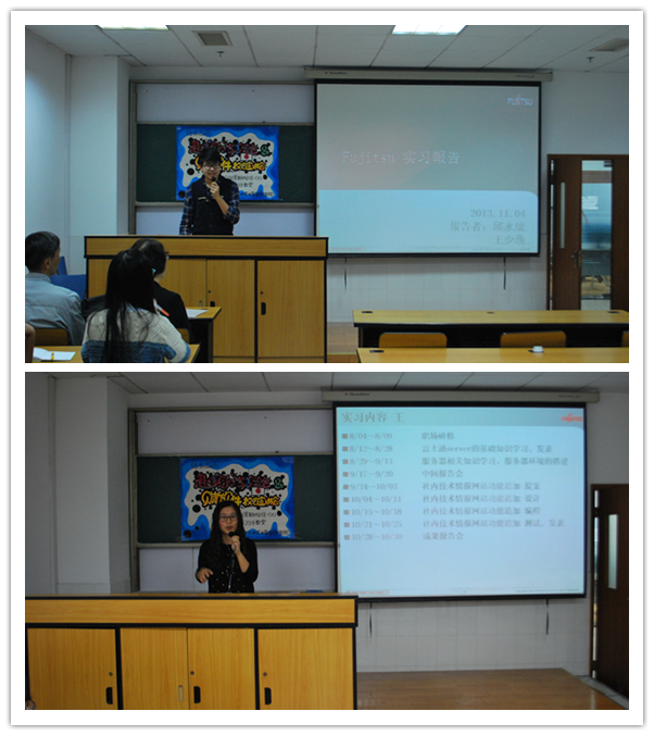 本次分享交流活动是为了给学生赴日实习就业搭建良好平台,使大家对赴日实习、就业有更深入的了解,为今后的发展提前做好充分准备。本次活动分为两个环节,首先由今年赴日本富士通公司实习三个月的10级学生代表邱永康,王少逸同学进行实习汇报。他们结合各自的亲身经历介绍了在日本富士通公司的实习工作情况以及在日本文化生活,与在场的同学分享工作体验,解答同学疑惑,并对希望赴日工作生活的同学提出了中肯的建议。