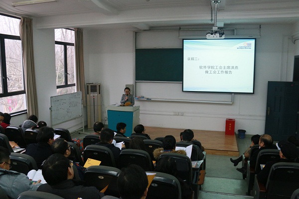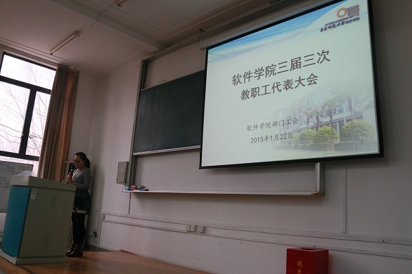 会议第二项议程是由软件学院工会主席洪燕向全体教职工代表做了2014年度工会工作报告,并获得与会代表的一致通过。之后,会议进行了增补第三届工会委员会福利委员的议程,经过代表们的无记名投票,吴蔚老师最终获选。