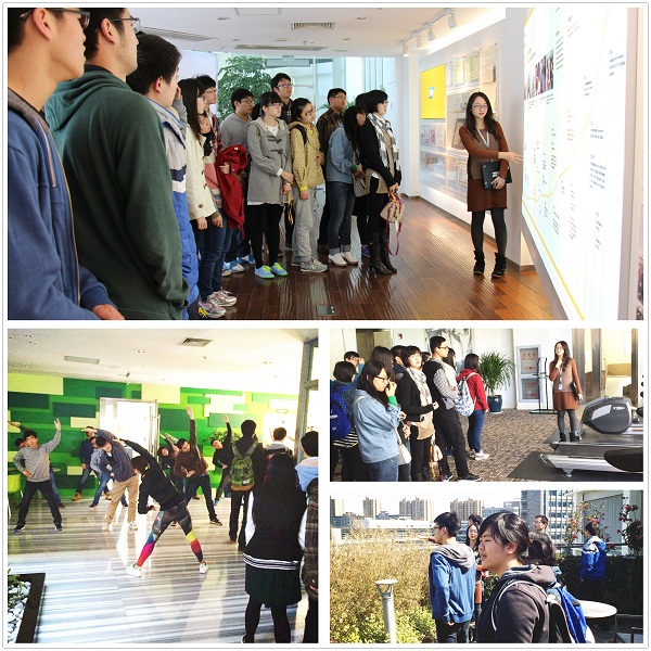 下午2点,同学们到达位于张江软件园的SAP中国研究院。首先由孙经理及两位同事分组带领大家参观SAP的工作环境。同学们通过孙经理的声情并茂的讲解,及实地参观公司发展历史展板、荣誉墙,餐厅、健身房、户外天台、咖啡休息区等各区域。通过健身房、咖啡吧等互动,亲历公司里一些员工正在进行瑜伽等身体锻炼活动,大家通过参与体验,亲身感受这全球领先的软件公司的特色文化。
