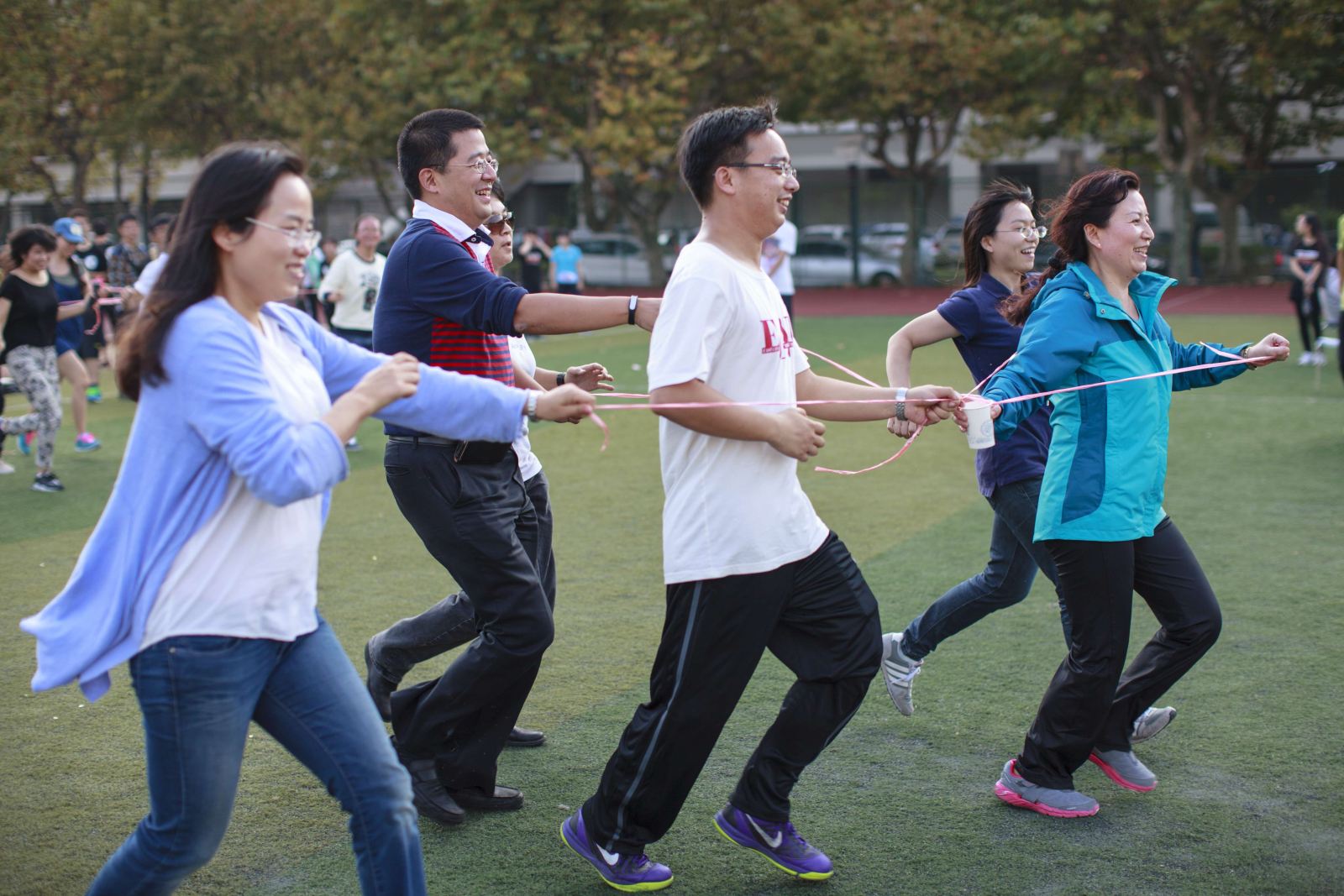在绿茵场上进行着的更有各类有趣有爱的团体项目。障碍跑趣味十足,躲避球欢乐无限,飞镖达人、我要那键盘、农夫山泉等项目把机会分给每个软院人,让运动的快乐沁入所有人的心中,“阳光伙伴”绑腿赛跑拉近你我之间的距离,满载着歌声与欢笑,向着夕阳,并肩奔跑。