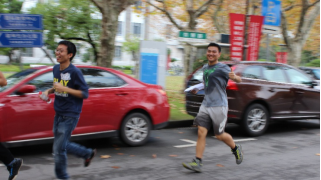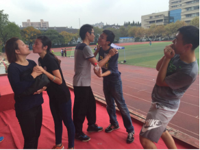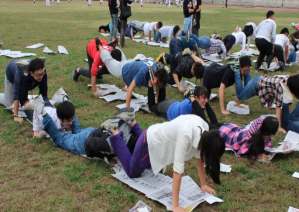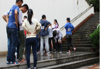 中午13点,参赛选手们分成了9组,他们虽然来自不同的学院、不同的年级,脸上却洋溢着一样充满活力的笑容。工作人员先分发任务书,宣布比赛规则。13点20分,定向越野活动正式开始,随着辅导员张炜帆老师的一声令下,所有在场同学一起喊出口号“奔跑吧!程序猿”,奔往第一个任务点——叠罗汉。即使面临着雨后湿漉漉的草地,高难度的配合动作等困难,但在大家的不懈努力下每个组都很快的完成了叠罗汉游戏,得到通行印章。之后,按照任务地图的指引下,奔向第二个任务点——up and down:体育馆阶梯下方,由工作人员发出开始指令,开始任务挑战。参赛队伍需要手牵手从左侧楼梯出发爬上楼梯,并从另一侧下来,在二楼平台期间,每位队员必须完成10个蛙跳,这样进行两个循环,挑战期间必须保证手牵着手共同完成。虽然两个任务点跨越了大半个校园,参赛选手们依旧全速而行。