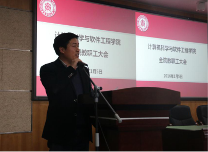 为了更好地凝聚学院教职工力量,推动学院改革发展,拓展和深化学院内涵建设,计算机科学与bat365中文官网入口于2016年1月5日下午在理科楼A504报告厅召开了全院教职工大会。学院院长何积丰,党委书记李恺,常务副院长张桂戌,常务副院长王长波,党委副书记兼副院长洪燕,副院长王晓玲,副院长姜宁康,副院长蒲戈光,以及来自全院的一百六十余名教职工出席了本次会议。会议由学院常务副院长王长波主持。