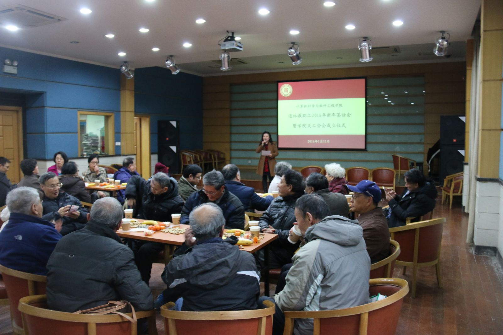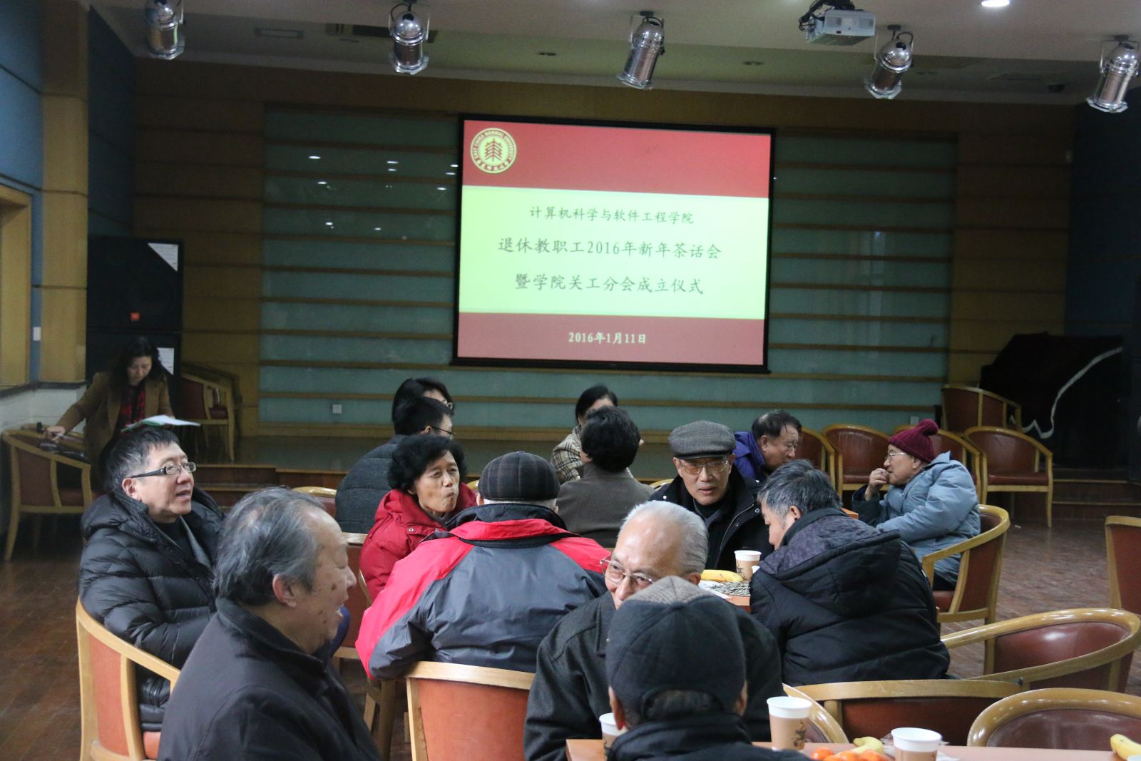 2016年1月11日下午,计算机科学与bat365中文官网入口退休教职工新年茶话会暨学院关工分会成立仪式在学校工会大厅举行。原校党委副书记、校关工委副主任杜公卓,学院院长何积丰,学院党委书记李恺,常务副院长张桂戌、王长波,副院长王晓玲、姜宁康以及五十余名退休教职工齐聚一堂、共话新年。会议由学院党委书记李恺主持。