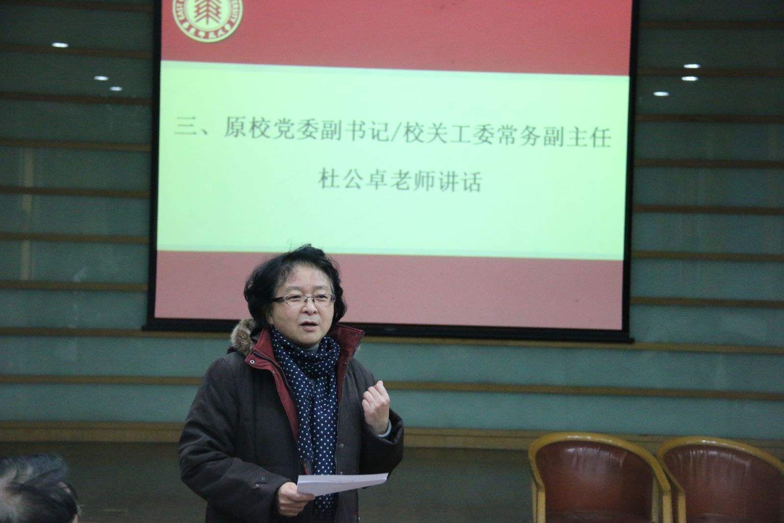 之后,学院党委书记李恺宣布学院关工分会正式成立,并介绍了本届关工分会的人员组成。李书记强调,关工分会的作用是利用退休教职工的资源来更好地做实关心下一代工作,发挥老前辈和老教师的余热,为我院青年教师和青年学生提供更好的教育和指导。原校党委副书记、校关工委副主任杜公卓则代表学校关工委向学院关工分会的正式成立表达了祝贺。杜老师说道,计算机科学与bat365中文官网入口关工分会的成立标志着学院关心下一代工作已经全面覆盖。杜老师还指出,bat365在线平台官网是一座优秀的高等学府,拥有不少优秀传统,但当前的社会是开放的,大学生在接触到正面积极信息的同时,也会接触到负面消极信息的影响,这就需要我们退休教职工发挥作用,给予正确的引导;希望在座的各位教师能够在退休之后继续支持学校工作,为培养下一代做出贡献。