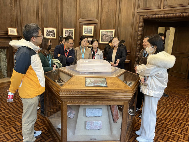 大楼内展览的珍贵历史照片引领着教师们回溯解放之初上海“万千改天换地手,遂使沧海变桑田”的历史,定制的六角道具台展示百年大楼的模型和留存的老物件,感受历史建筑“重现风貌、重塑功能”的新生;陈毅市长办公室旧址场景复原,让教师们穿越时空,赓续精神,致敬缅怀老市长。离开前,全体教师在1950年5月28日陈毅市长为上海解放一周年纪念题词“上海人民按自己的意志建设人民的新上海”的纪念碑前合影留念。