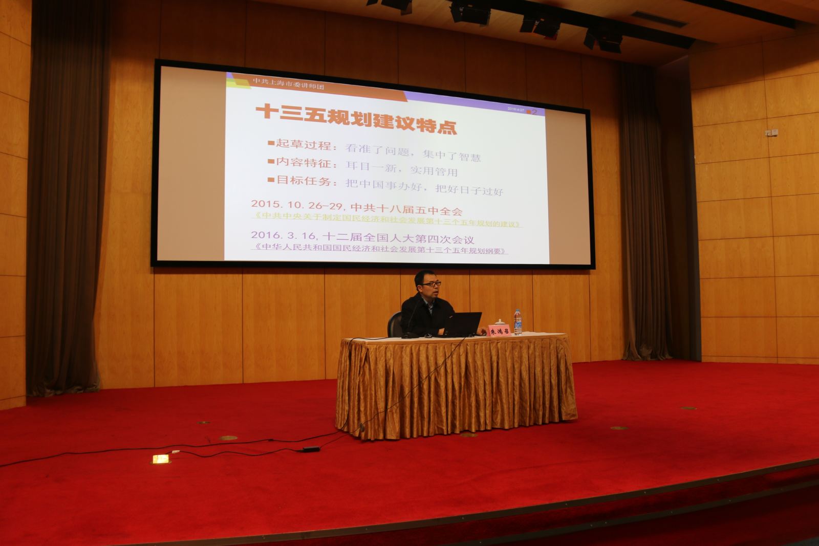 报告会上,朱鸿召围绕十八届五中全会的重要成果——《中共中央关于制定国民经济和社会发展第十三个五年规划的建议》(下文简称《十三五规划建议》)娓娓道来,向大家介绍了“十三五”规划制定的背景和过程,用“2+5+1”的公式形象概括了《十三五规划建议》的主要内容:2个目标任务、5个发展理念、1个政治保证。接着,朱鸿召从“全面建成小康社会的政治保障”、“重要战略机遇期内涵发生变化”、“中国社会主要矛盾内涵发生变化”、“确立五大发展理念”四个问题切入,结合“一带一路”、深化改革、上海未来发展等热门话题,对《十三五规划建议》的内涵进行了系统的讲析。最后,朱博士用“四余堂训”为报告收尾,给观众留下了无限的思考空间。