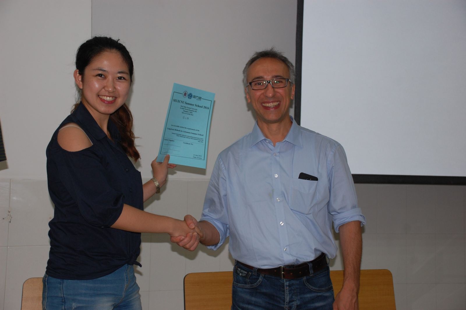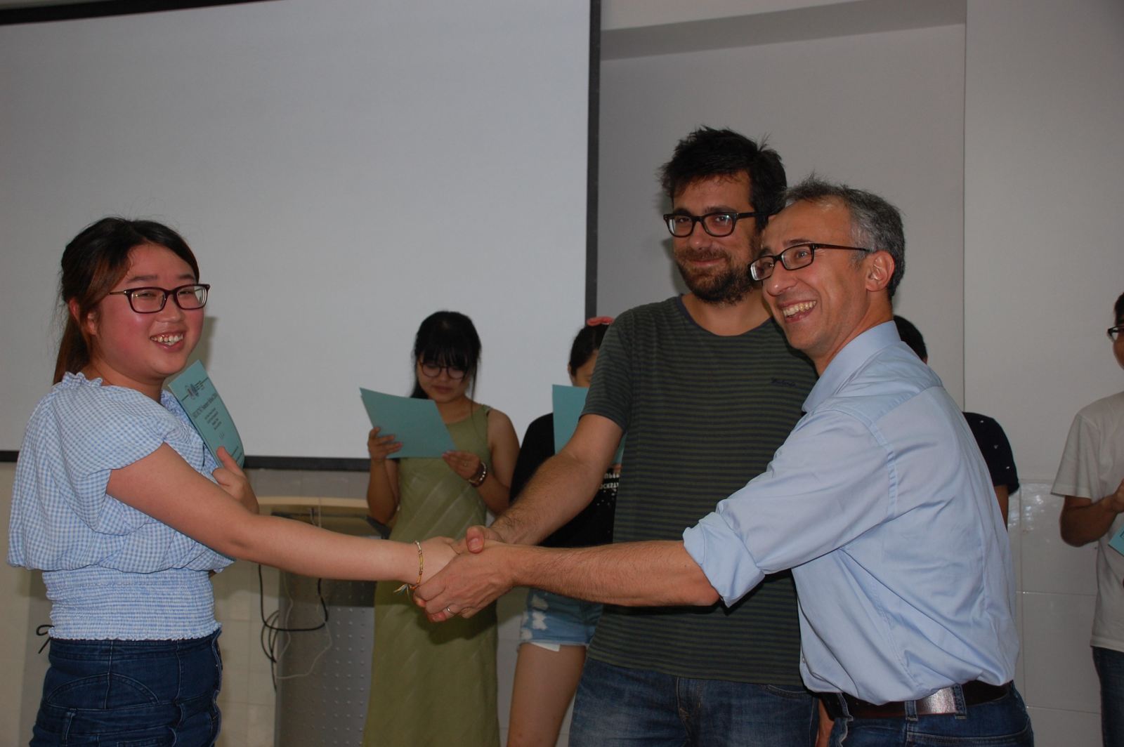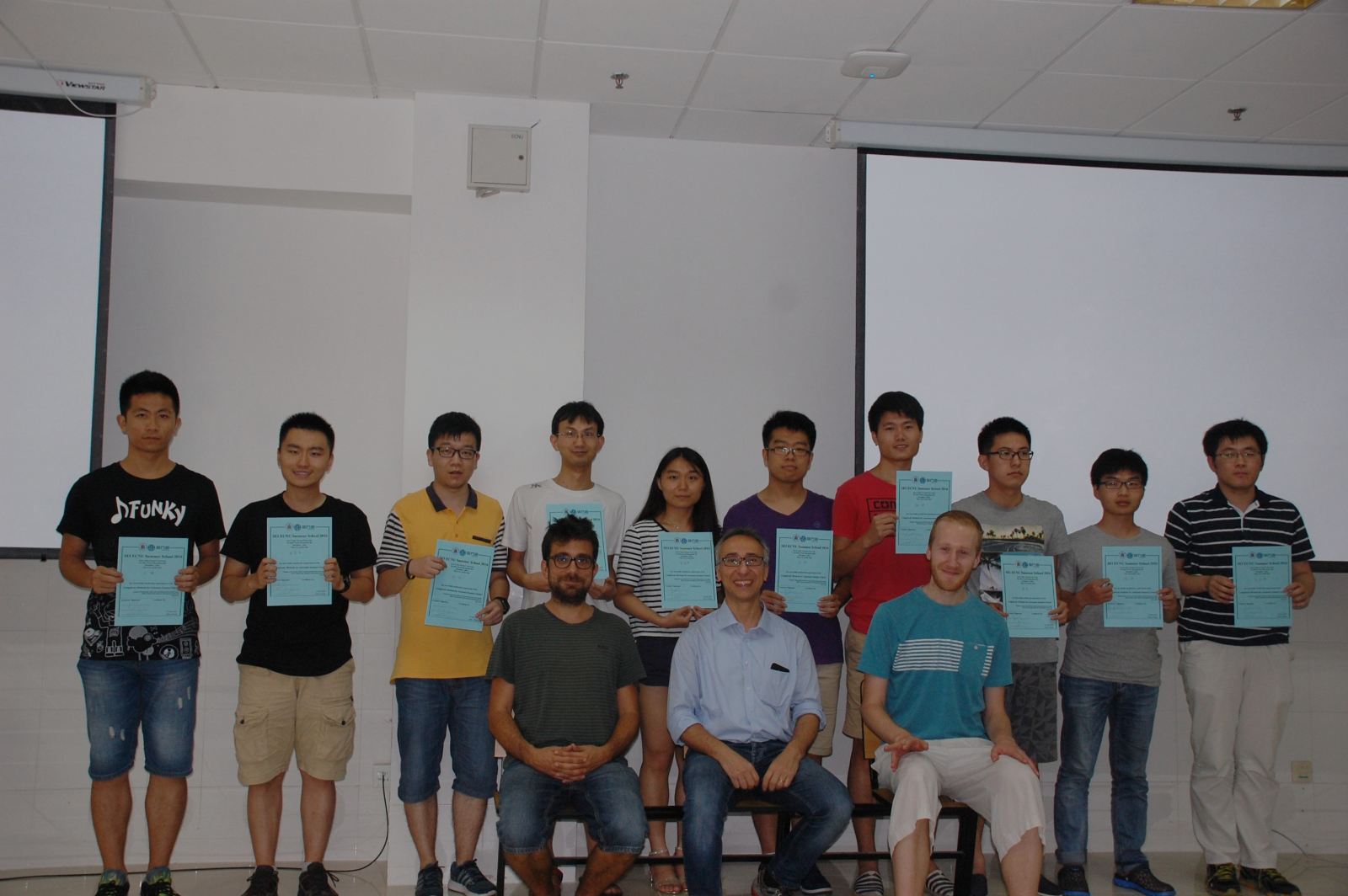 闭幕式上,本次暑期学校的负责人张敏老师对此次暑期学校作了回顾和总结,向与会的教授、坚持参加课程的师生们和本次暑期学校的志愿者和工作人员表示由衷的感谢,寄语学员们要进一步深入学习各种新知识。随后,张敏老师、Marcello Bonsangue副教授、Filippo Bonchi和Jurriaan Rot研究员为表现优异的学员们颁发了结业证书,并与学员进行合影。最后,在热烈的掌声中,bat365在线平台官网计算机科学与bat365中文官网入口自动机理论中的余代数方法暑期学校顺利落下了帷幕。本次的暑期学校具有很强的创新性,理论与实践结合,以服务广大学员为根本,受到了较高的评价。在此次暑期学校的学习中,通过和外国教授的互动、同其它学员的讨论,学员们的眼界得到了开阔,理论水平得到了提高,学习兴趣也大大增加。