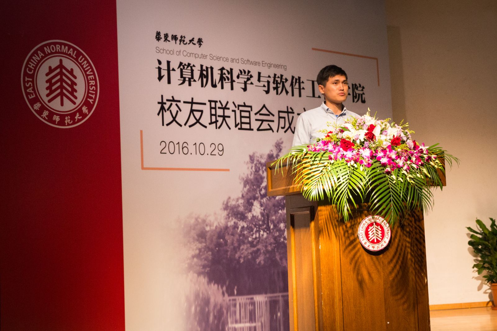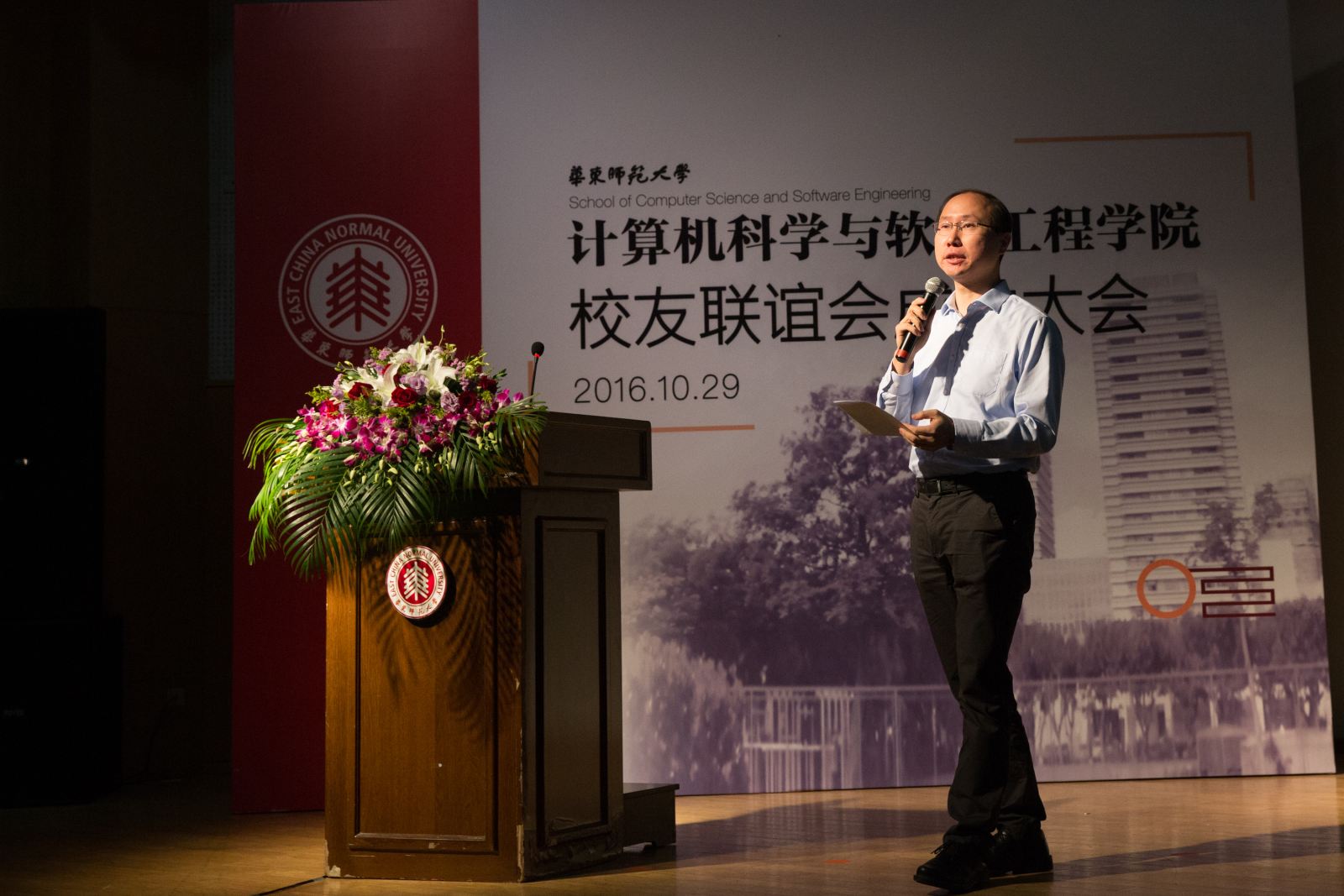 校友联谊会副会长、上海游族信息技术有限公司副总裁、2000级校友胡振凯发言,他深情回顾了在华东师大学习的经历,对学校的培养和学院老师的教诲表达了由衷的谢意。他指出,校友联谊会体现了“融合”之精神,体现在三个方面:学生与社会的融合,细分领域优势到合作的优势以及个人与团队的融合。最后,副会长胡振凯强调只有团结在一起,才能给自己,团体和国家带来机会,带来成功。