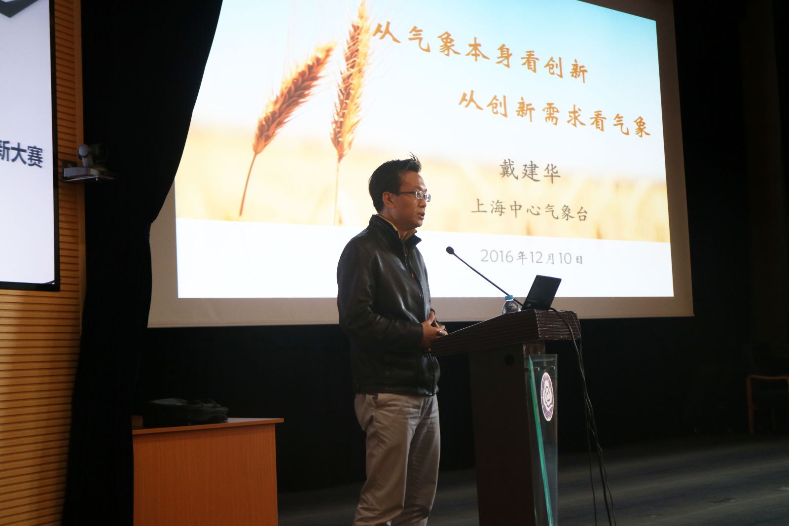 上海市中心气象台首席预报员戴建华以“从气象本身看创新,从创新需求看气象”为题跟同学们分享如何做好气象领域的创新探索。通过对“气象应用的创新”的分析,从“行业光、方式多、技术新、重体验”这四个方面揭示了气象方面创新的必要性。之后便提出了创新在气象领域的需求,在抛出了一个个亟待解决的问题后,以天气预报为例讲述了业务发展总体思路和重点发展方向。最后,戴博士从创新本身看创新,抓住“核心技术”这一最主要的环节,向同学们诠释了创新的要求,并对同学们的创新创业给予了诚挚的祝福。