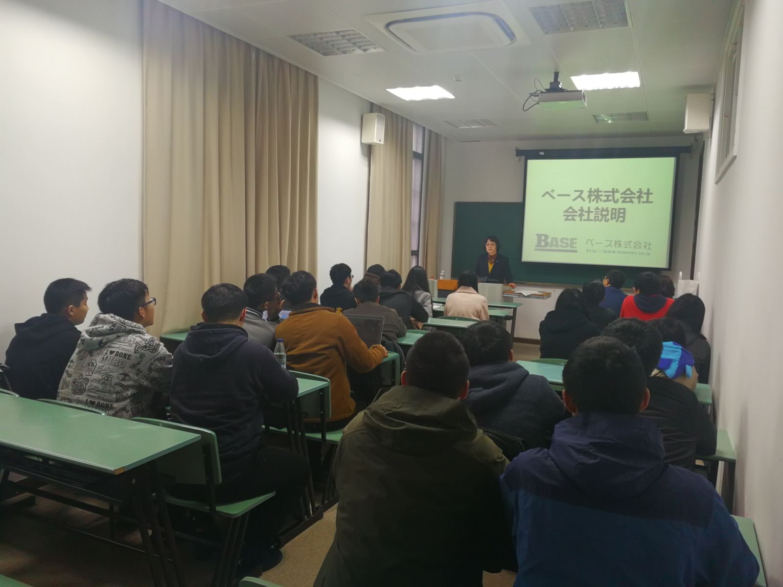 宣讲会的第一部分,日方代表对日本贝斯株式会社的具体情况作了介绍。贝斯株式会社是由在日华人创办的软件开发企业,公司总部位于日本东京的秋叶原UDX8F。公司业务主要面向金融、流通、SAP领域开发,拥有富士通集团、金融大手瑞穗集团、野村综研、埃森哲、TIS、kabu.com等客户,是富士通集团、野村综研的核心合作伙伴之一。接下来,日方代表用具体的数字向同学们介绍了公司的发展状况。公司创立20年来业绩持续增长,2016年的营业额超过48亿日元,经常利润超过8亿日元。除工作以外,还介绍了丰富的业余活动俱乐部,包括滑雪、插画、足球、篮球、网球、摄影等等。