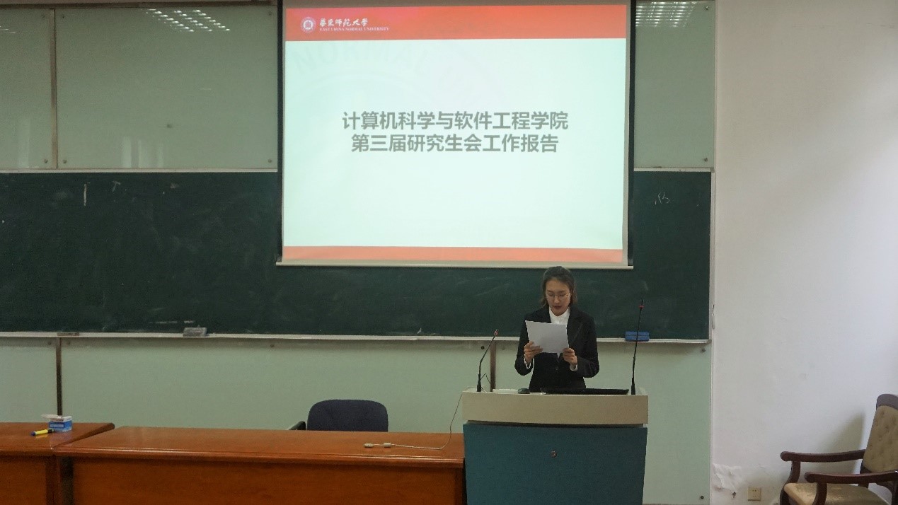 随后,第三届研究生会主席李金洋同学代表研会作出了工作报告。她汇报了研会一年以来在校团委、校学生会和学院团委的指导下,在各位指导老师的帮助支持下、在广大同学的支持、配合下做出的工作和取得成绩。她着重强调了院研会全体成员在完善部门职能,丰富活动形式,以及开展权益工作,加强对外交流等方面做出的工作成果,并对研会未来的发展进行了展望。