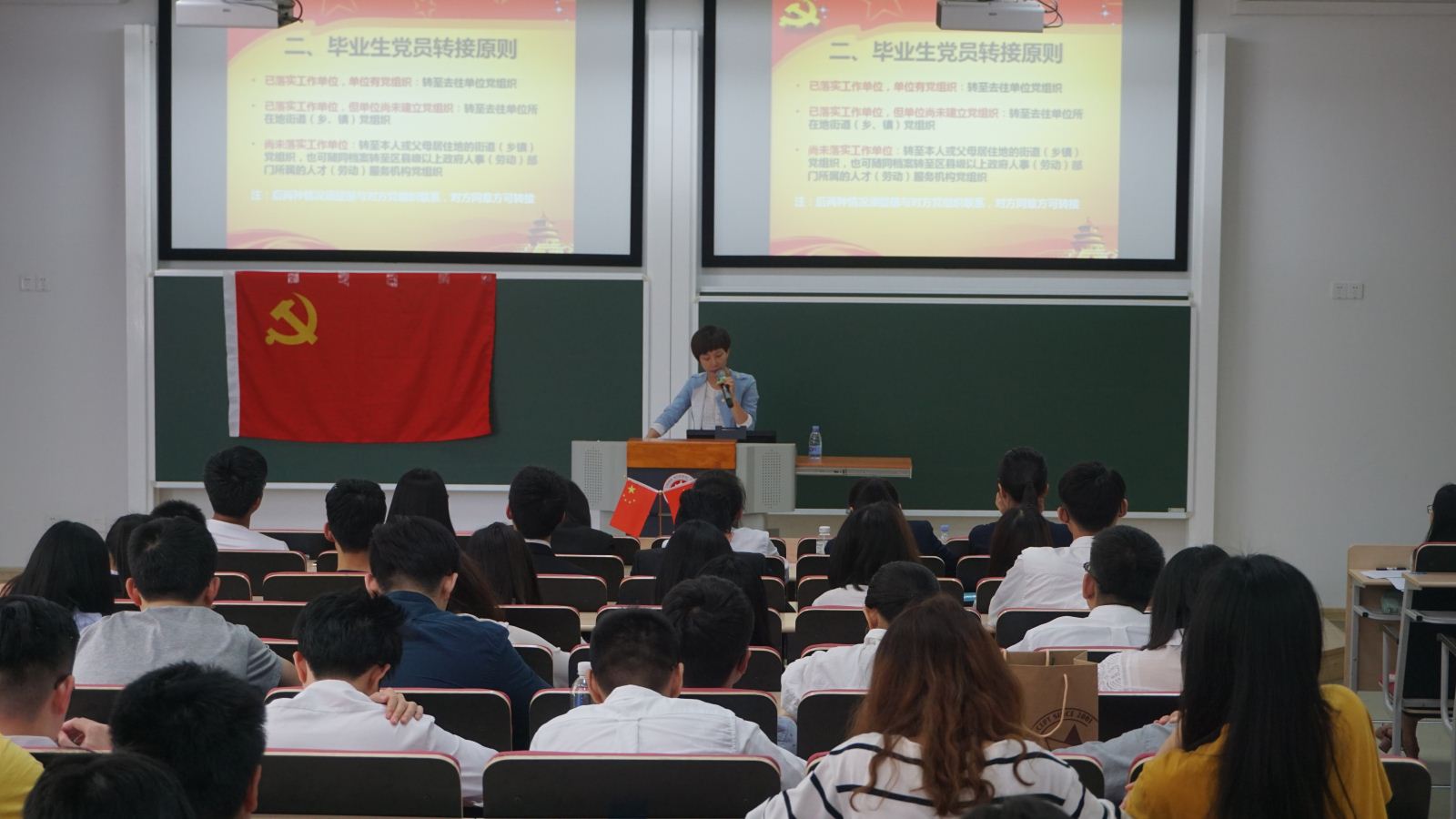 学生工作党委副书记江乃兵受邀为全体毕业生党员上在校期间的最后一次党课,他以《毕业生党员的修养》为题,深入讲解了作为一名即将迈向社会的党员所应具备的素质修养,他强调,党员要以共产党为荣,严格要求自身,不断求知,不断进取,关心国家大事,以主人翁的姿态为国家、为社会做出自己的贡献。他还现场邀请毕业生党员朗诵诗歌《我骄傲我是中国人》,党员们都深受感动。最后由计软院学生党建指导老师刘国艳,讲解组织关系的转接流程。