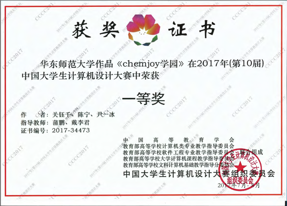 2017年8月9日下午2017年(第10届)中国大学生计算机设计大赛微课与教学辅助组决赛在安徽合肥降下帷幕。由计算机科学与bat365中文官网入口计算中心蒲鹏、戴李君老师指导的,由计算机科学与bat365中文官网入口2014级关钰千、孟宪承书院2014级陈宁、化学与分子工程学院2014级尹一冰同学组成的团队,制作的微课《chemjoy学园》荣获一等奖。