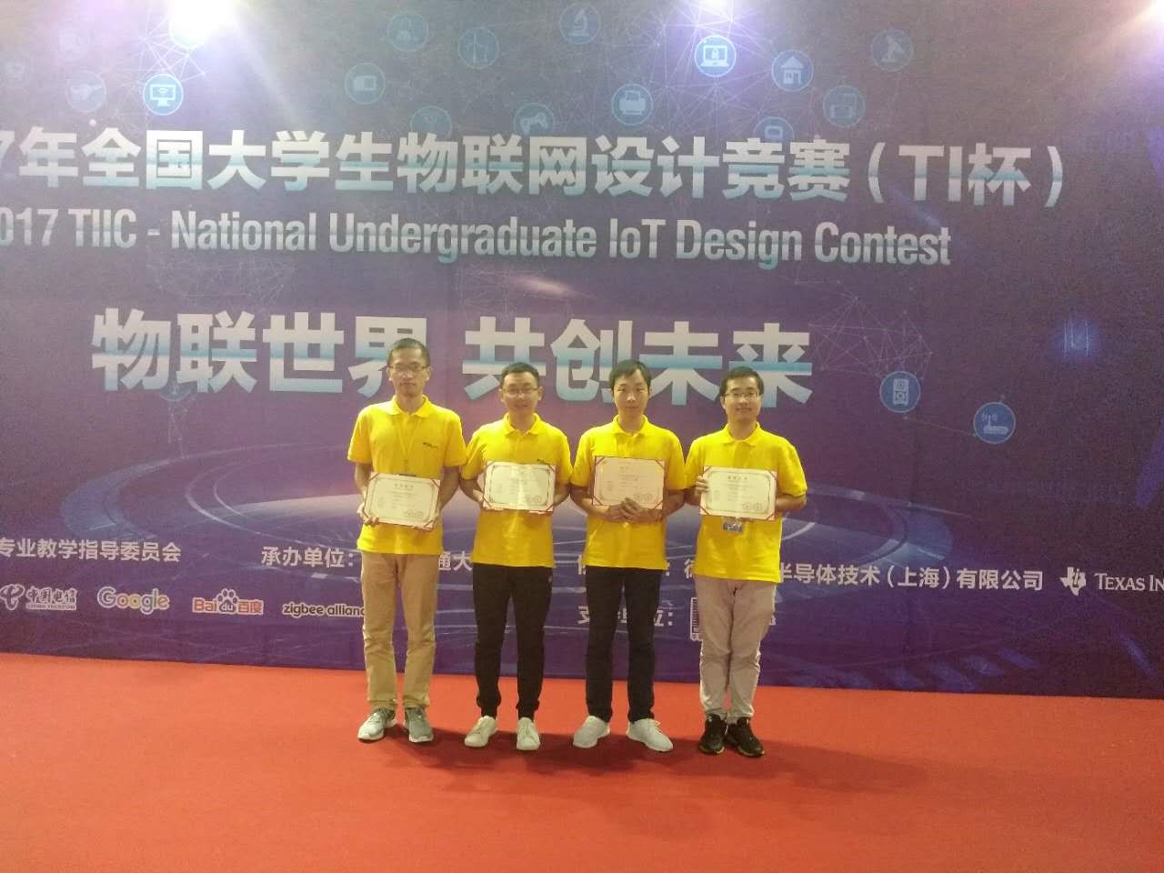 9月11日下午,2017年全国大学生物联网设计大赛总决赛在江苏无锡落下帷幕,由计算机科学与bat365中文官网入口嵌入式系陈铭松老师指导的,2016与2015级研究生葛子帅、宋进忠、吴庭明、田放组成的团队,制作的《健康骑行》荣获全国一等奖。