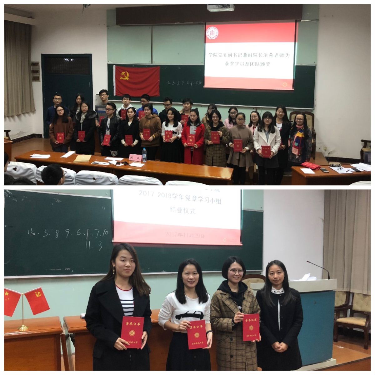 为进一步弘扬十九大精神,紧随党的前进步伐,同时牢记党的奋斗历程,增加学生对党章党史的了解,增强学生爱国爱党的意识,2017年11月29日,党章学习小组成果展示暨结业典礼在数学馆113教室顺利举行。学院常务副院长王长波老师、党委副书记兼副院长洪燕老师、17级软件工程本科生辅导员朱莺老师及党章学习小组全体学员出席了本次活动。结业仪式由鲁梦洁同学和杨浩同学主持。