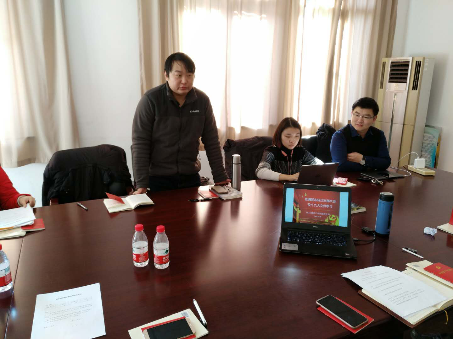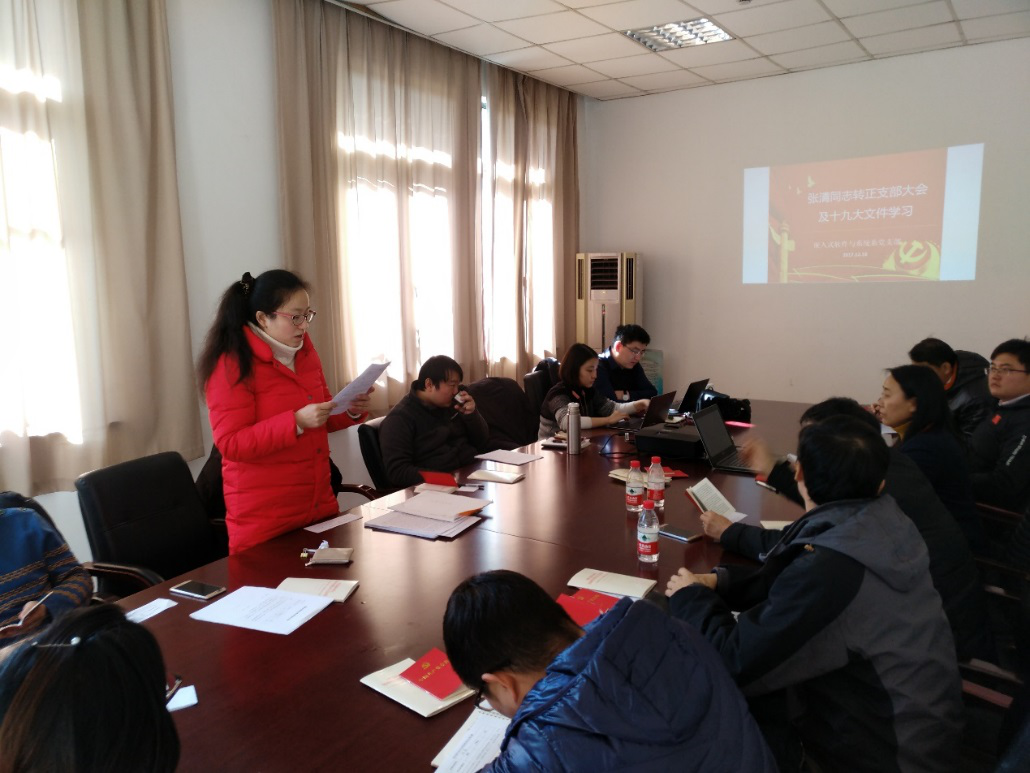 12月18日中午,嵌入式软件与工程系党支部在数学馆东202召开了党支部会议。本次会议共两项议程,包括预备党员张清同志的转正大会,以及认真学习和讨论学院新下发的《中国共产党党章》和习近平同志在中国共产党第十九次全国代表大会上的报告《决胜全面建成小康社会 夺取新时代中国特色社会主义伟大胜利》等材料。