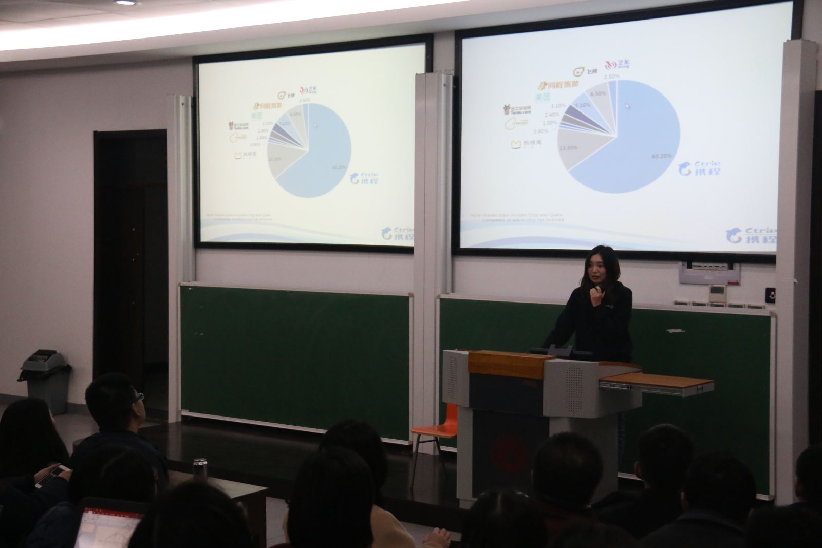 暖场视频后,09级校友黄镱铷女士首先向大家介绍了携程的硬实力。携程旅行网创立于1999年,总部设在中国上海,现有员工30000余人,在北京、广州、深圳等国内17个城市设有分公司。目前,携程是中国最大的旅游集团。