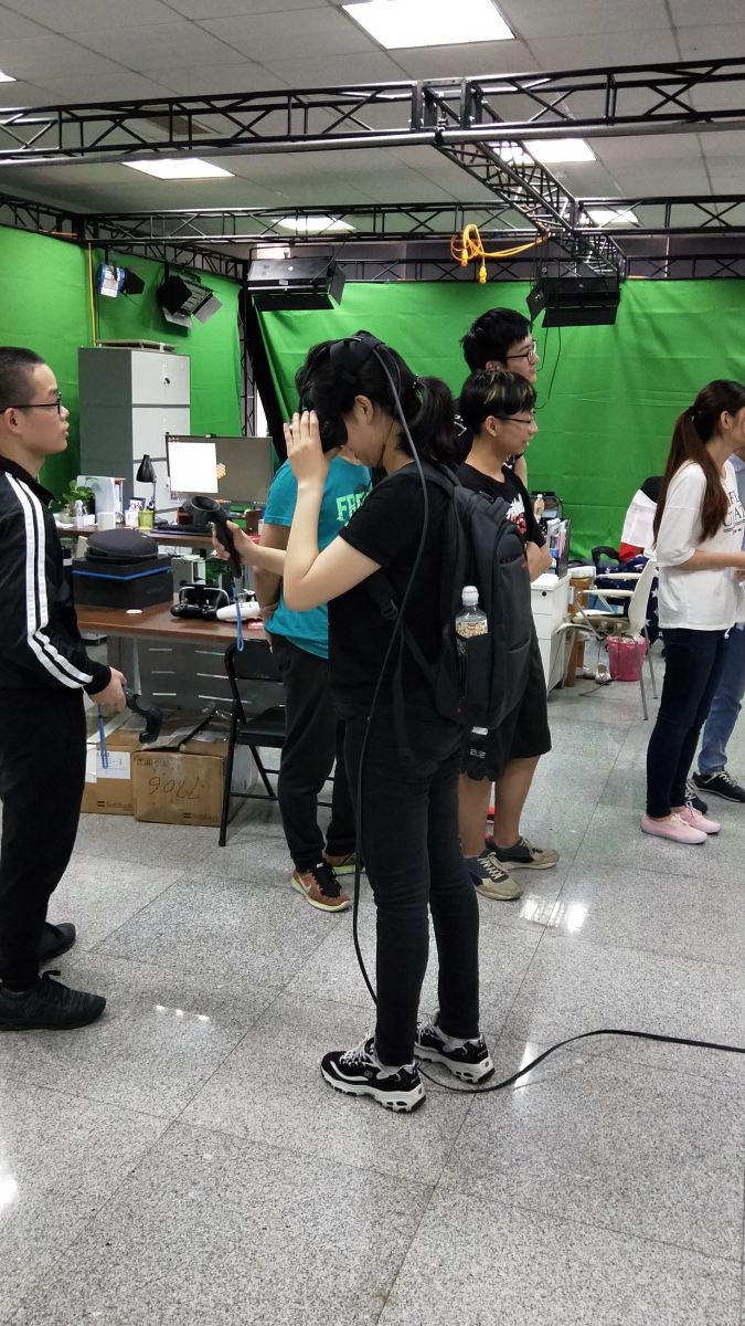 研究生学长胡军向同学们介绍了虚拟现实的概念——利用计算设备产生一个三维的虚拟世界,并指导同学使用HTC VIVE——HTC和VALVE合作推出的一款虚拟现实头戴式显示器。在学长的指导下,同学们参观了智能机器人运动与视觉实验室和工厂等场景,还进行了射箭游戏和枪战游戏,充分体验了VR的乐趣。