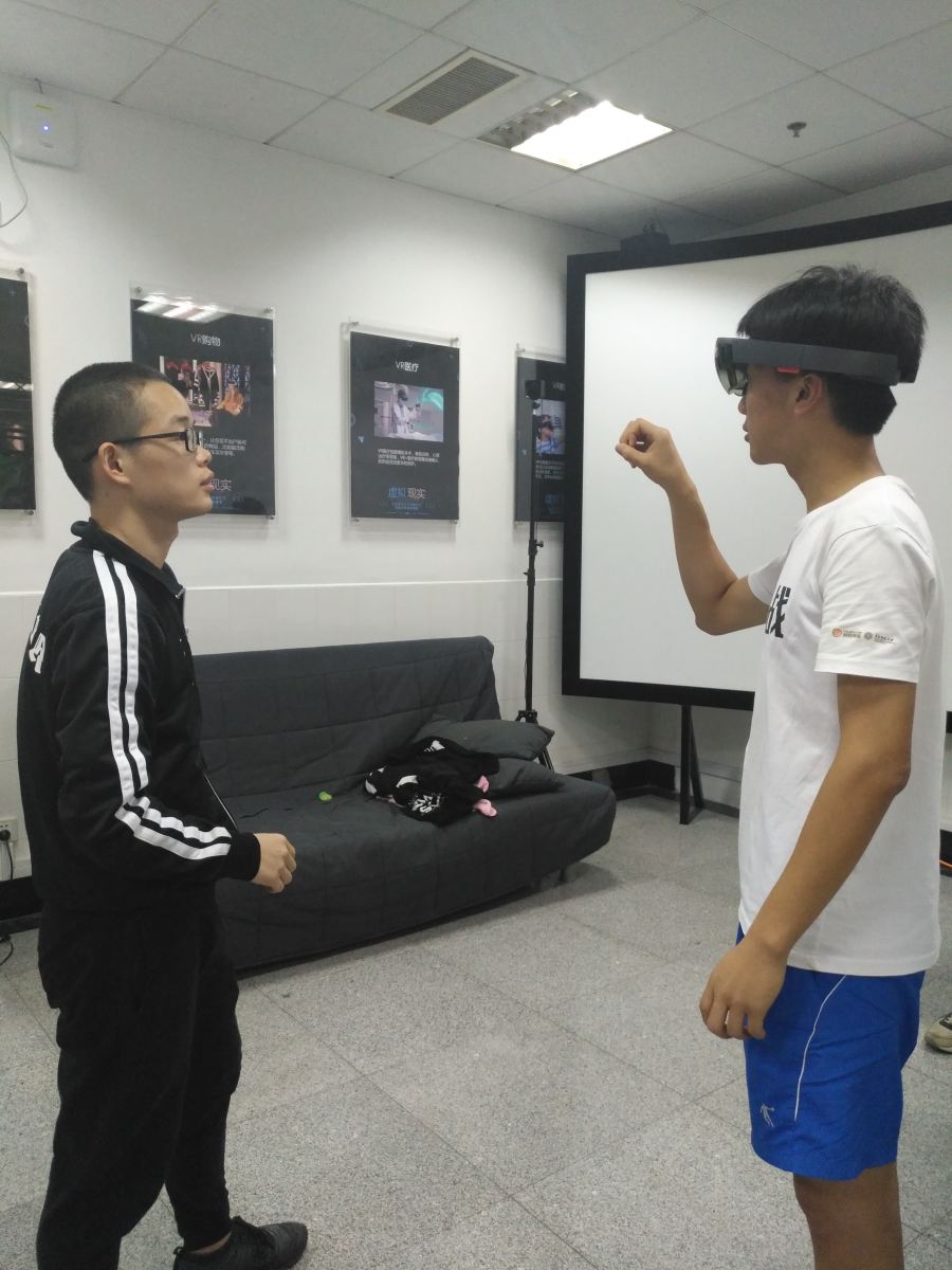 嵌入式方向15级的陈攀学长先介绍了AR的概念——在屏幕上把虚拟世界套在现实世界并进行互动,并讲解了AR与VR的不同之处在于是否能够观察到现实世界,然后胡军学长指导同学们使用Microsoft HoloLens——微软的一款增强现实头显设备,通过手势操控投影在眼前的场景。