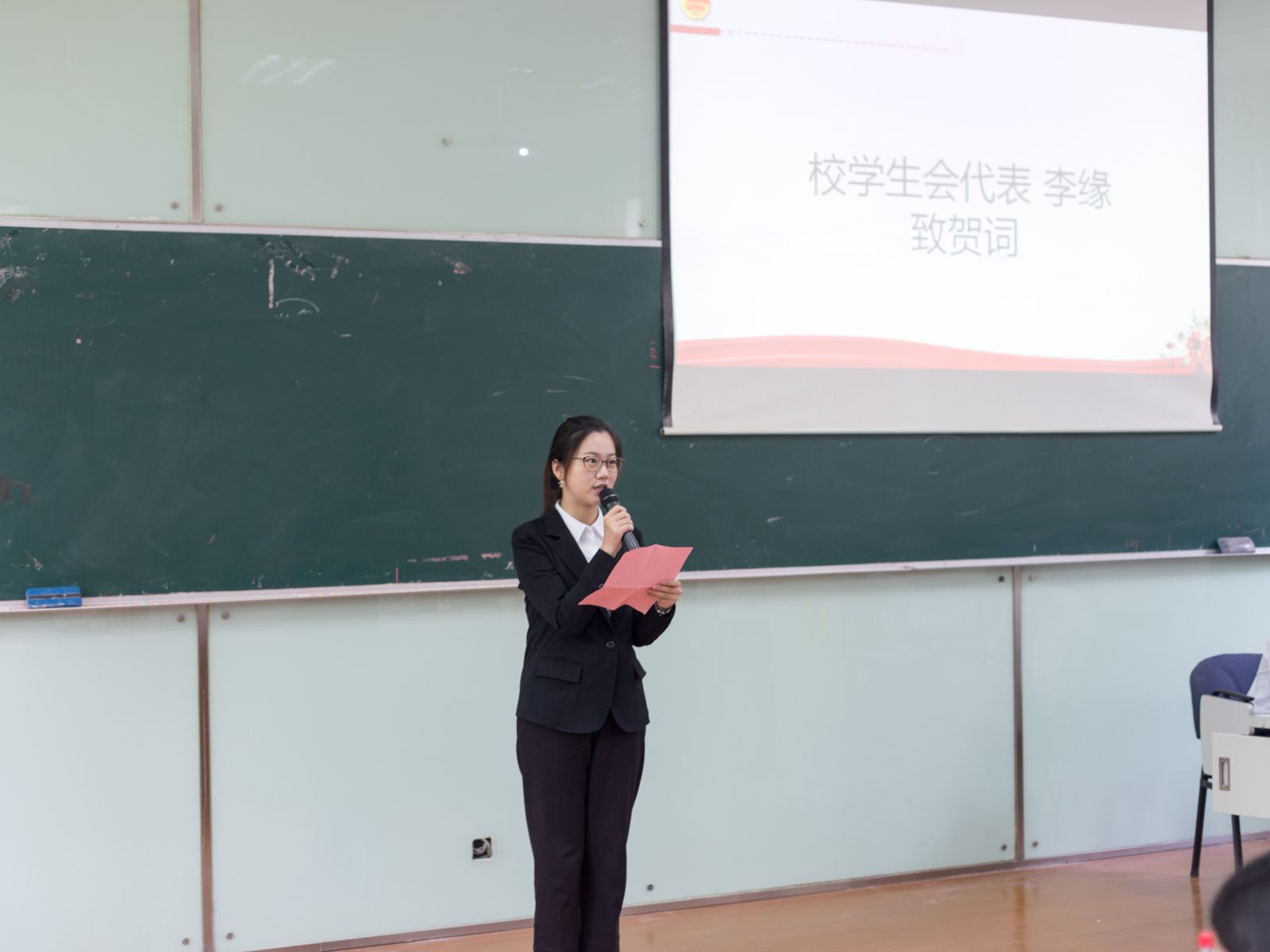 图二:校学生会副主席李缘同学宣读贺信