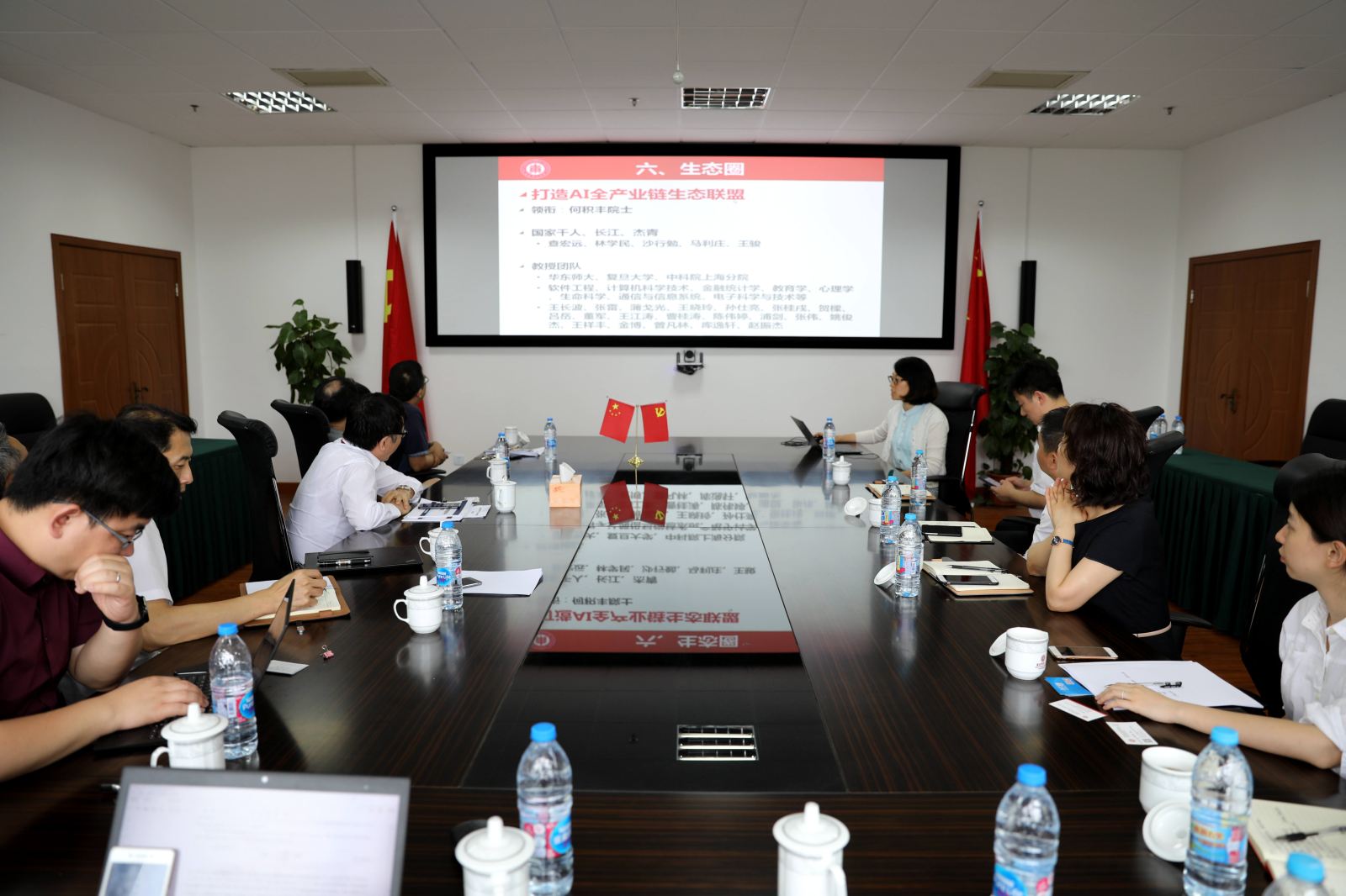 首先,吴俊副局长介绍了建设人工智能的急切需求以及来我院调研的主要目的。院长何积丰院士介绍了学院在人工智能理论、技术以及应用等方面做的一些工作以及人工智能研究所建设情况。副院长王晓玲教授先后介绍了学院的基本情况、前期工作基础以及研究院的建设方案。