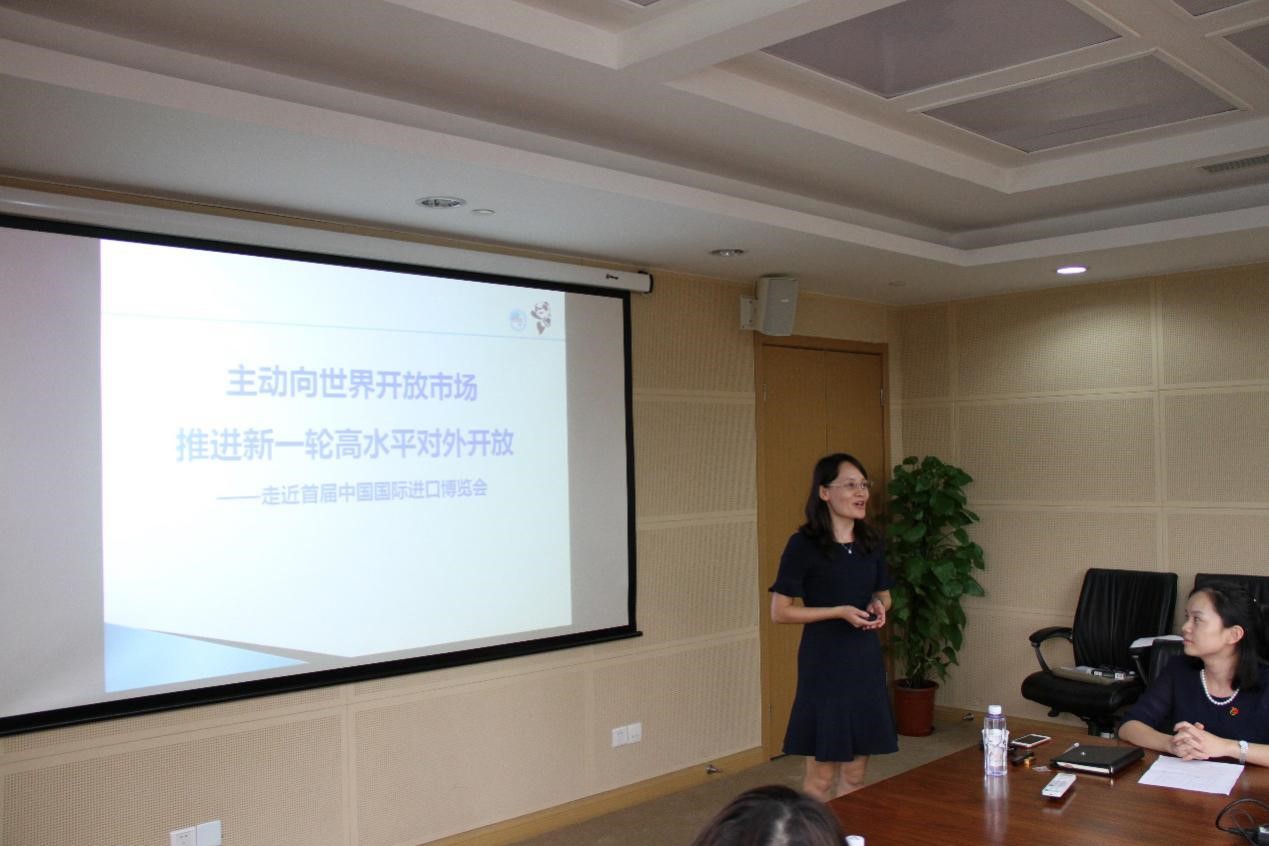 首先,刘小珍主任向大家介绍了进博会的背景和意义。在中美贸易战背景下,举办进博会是以习近平同志为核心的党中央着眼新一轮高水平对外开放作出的重大决策,是中国政府坚定支持贸易自由化和经济全球化、主动向世界开放市场的重大举措,有利于促进世界各国加强经贸交流合作,促进全球贸易和世界经济增长,推动开放型世界经济发展。
