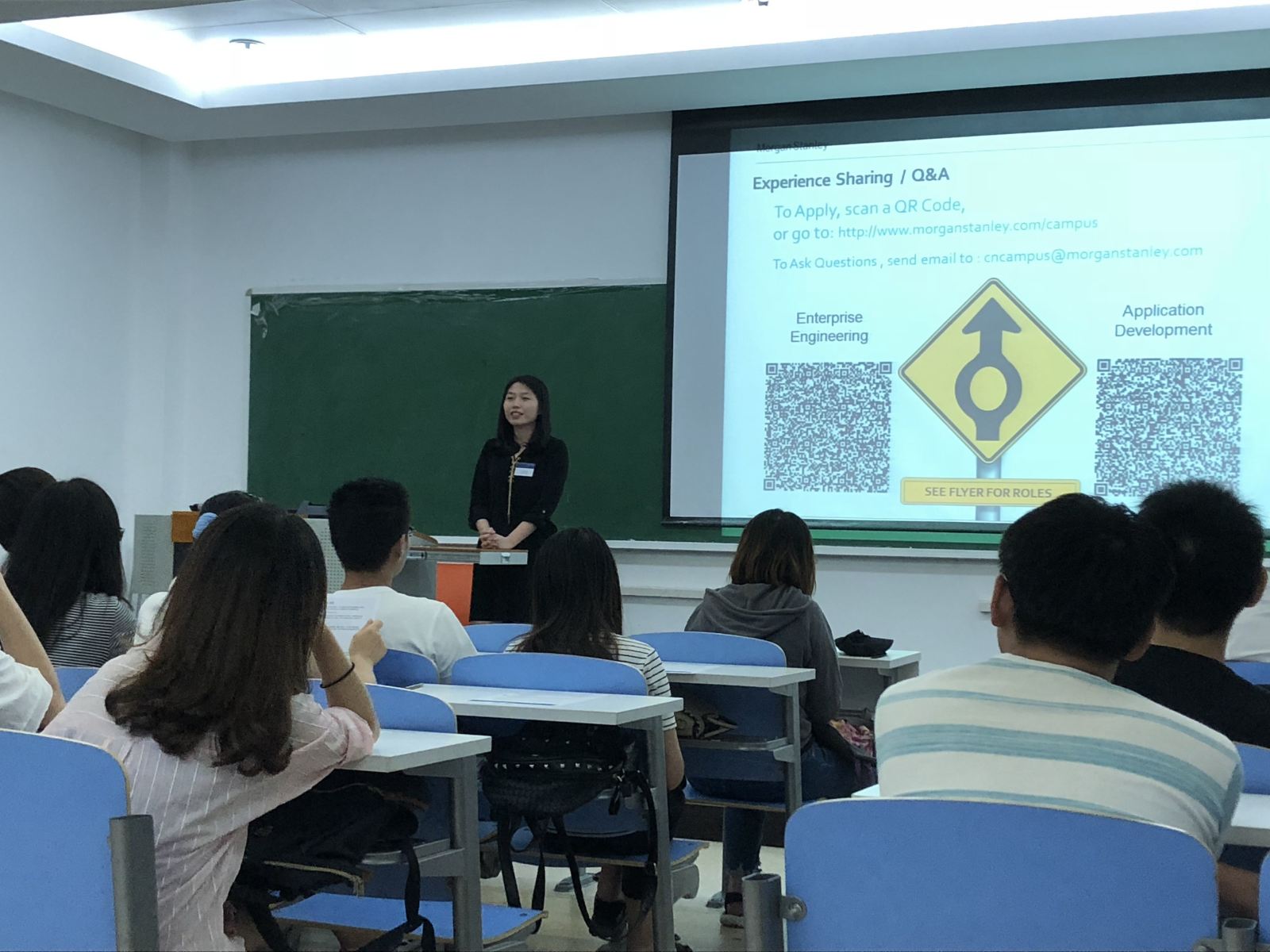 Hao Yang先生介绍道,摩根士丹利是投行中第一家进入中国设立研发中心的公司。公司注重员工的“Long Term Development”,在技术部门,公司除了对员工技术能力的培养,也会着重培养金融知识和各项软技能。他热烈欢迎同学们加入公司的“Graduate Training Program”。