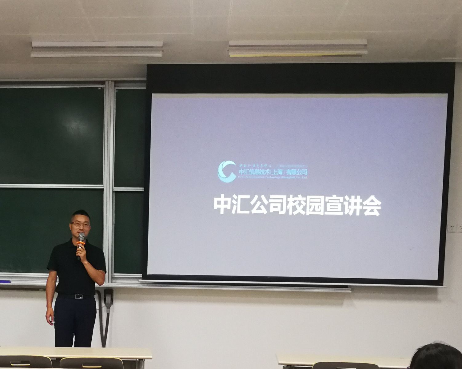 他向大家详细介绍了中国外汇交易中心,并进一步阐述了公司的基本情况,让到场的观众对公司规模以及业务状况有了一个初步的认识。他还详细介绍了公司的技术发展,中汇信息技术实行导师带教制度,通过老员工带新员工的方式,为刚步入职场的毕业生们提供一个很良好的过渡阶段。同时,公司具有内容丰富的培训平台,设有区块链、大数据分析与应用、人工智能等多种技术兴趣小组。另外,公司为员工提供了许多培训、考试机会(如PMP证书)。
