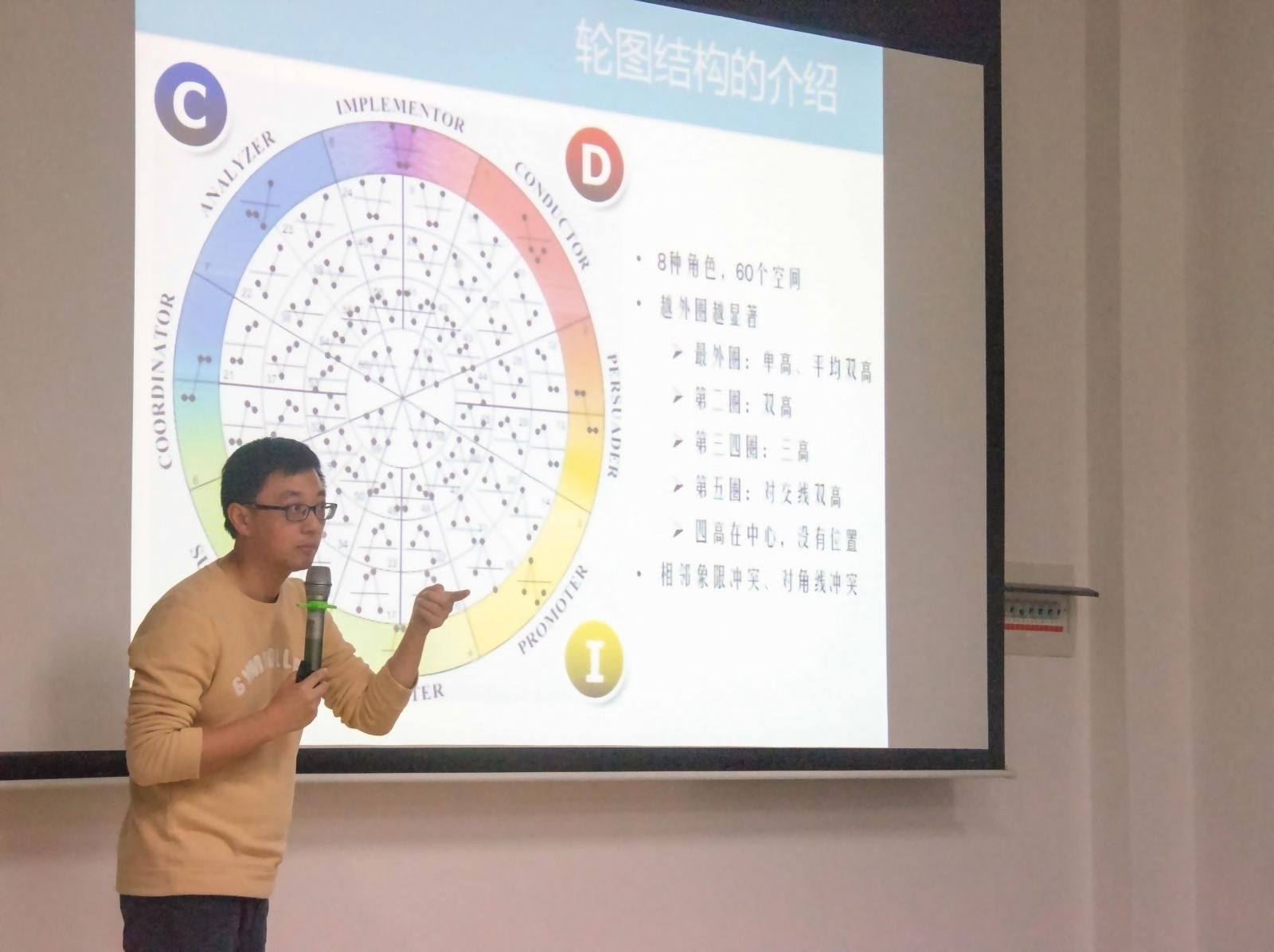 待孙宇学长根据每组的发言作出点评后,对DISC四种模型做出了详细解释,并提出了轮图结构,阐述了轮图上每个部分的人的性格、优缺点、适合的工作方向以及所具有的特有的肢体语言和语音语调,也介绍了在与不同模型的人交流时应该注意的细节。