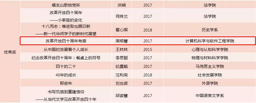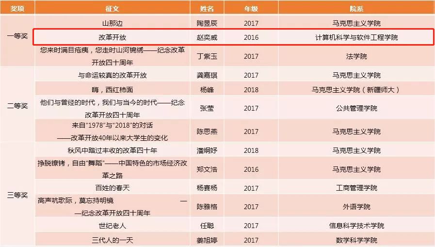 为纪念中国改革开放四十周年,bat365在线平台官网马克思主义学院与学生工作党委、学生工作部联合举办了“bat365在线平台官网纪念改革开放四十周年”征文活动,经专家初审、复审、公示等层层筛选,共评选出23篇获奖征文。其中,计算机科学与bat365中文官网入口赵奕威、周明慧分获一等奖和优秀奖: