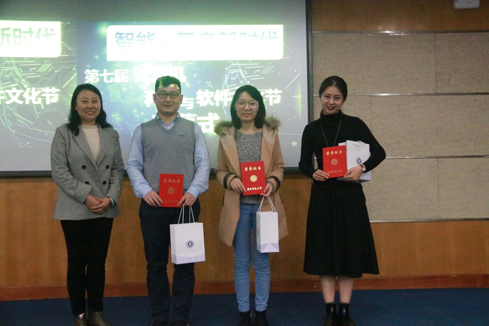 主题演讲结束后是缔安奖学金的颁奖仪式。缔安奖学金由上海缔安科技股份有限公司建立,旨在嘉奖在科技创新、学术研究方面取得优异成绩的团队。获得一等奖的有张思源团队和周亦然团队,获得二等奖的有黄可蒙、谢嘉东团队;获得三等奖的有杨英明团队、朱鹏飞团队、陈攀团队。曹桂涛老师和缔安公司人事经理刘玉为获奖团队颁奖。刘玉女士随后致辞:“刚才嘉宾谈到AI是未来,但我希望在座的你们更是未来!”引发同学们热烈掌声。