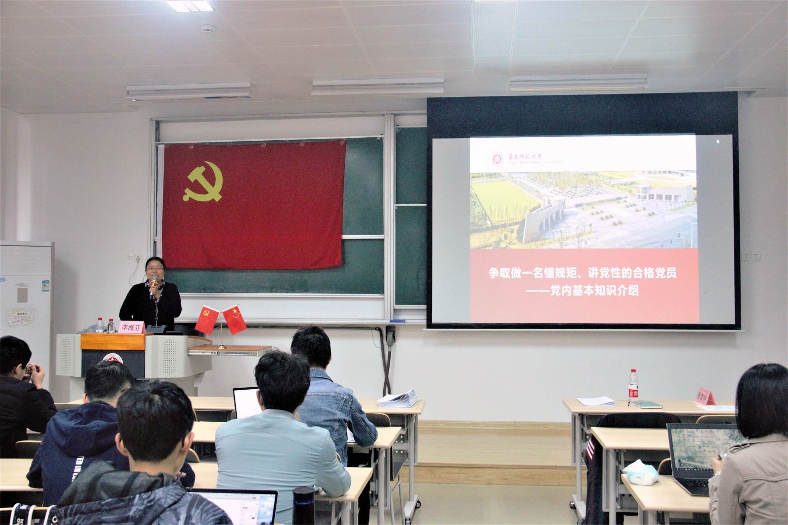 李海芬老师结合最新的党员发展规定和党支部工作要求,作了题为《争取做一名懂规矩、讲党性的合格党员——党内基本知识介绍》的主题报告。首先,李老师详细介绍了入党的流程,主要包括入党条件、入党过程中不同的身份及其所应该承担的具体任务。接着,李老师向同学们讲述了入党后必须进行的“三会一课”、组织生活会、民主评议会、谈话汇报制度等组织生活制度,让大家对入党后的组织生活有了更具体、更清晰的了解。此外,李老师向大家说明了交纳党费的注意点以及转接组织关系的具体流程,并对党员出国(境)的情况作了详细阐述。最后,李老师给同学们推荐了《中国共产党发展党员工作细则》、《bat365在线平台官网党支部工作细则(试行)》等学习资料以及“学习强国”APP、“共产党员”等新媒体资源,让同学们能在党课之余也能不断加强理论学习,提升党性修养。