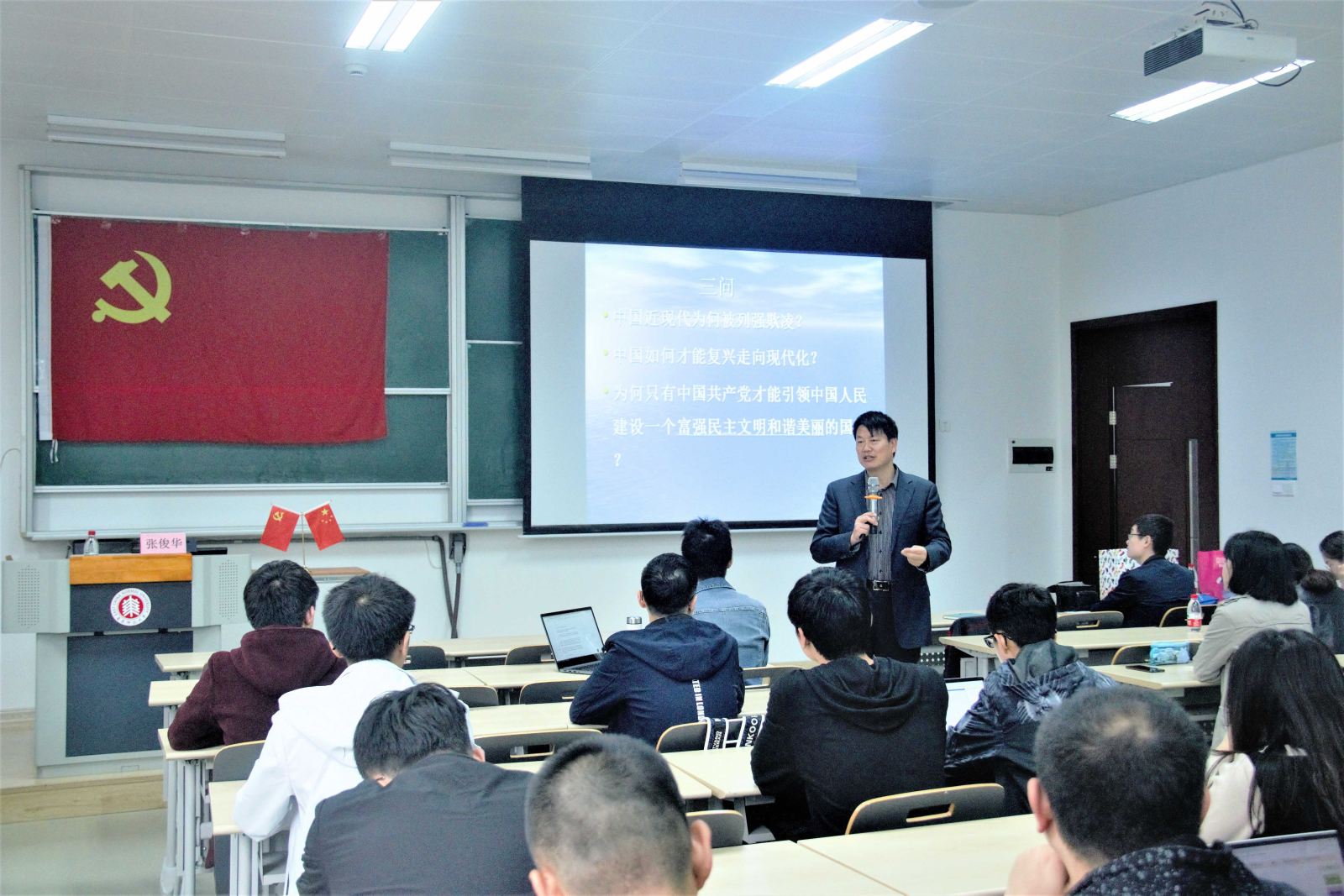 党校副校长张俊华老师为学员们带来了一场题为《理想••信仰••责任》的主题演讲。演讲之前,张俊华老师向同学们提出了引人深思的三个问题:中国近现代为何被列强欺凌?中国如何才能复兴走向现代化?为何只有中国共产党才能引领中国人民建设一个富强民主文明和谐美丽的国家?针对这三个问题,同学们纷纷发表了自己的看法。接着,张老师从中国近代历史入手,深入浅出地分析了中国遭受屈辱的原因。张老师指出,生活在和平年代的我们不应该铭记仇恨,但也不能忘记历史。对于当今的世界动荡局势,张老师认为祖国只有更加富足,更加强大,才能实现持续的和平、稳定和发展。我们此时正生长于最好的历史时期,更应该常怀感恩之心。紧接着,张老师对比了东西方科技的差距,讲述了老一辈科学家无私奉献的故事,指出理想和价值是指引人生奋斗的不竭动力,生活在新时代,作为一名未来的科学家、作为一名入党积极分子,更应该牢记自己的使命和责任,牢记中国共产党的宗旨是“一切从全中国人民的利益出发,全心全意为人民服务,不惜牺牲个人的一切,为实现共产主义奋斗终身”。张老师最后向大家提出期望,希望同学们在心中培育自己的理想、信仰和责任,并为之努力奋斗。