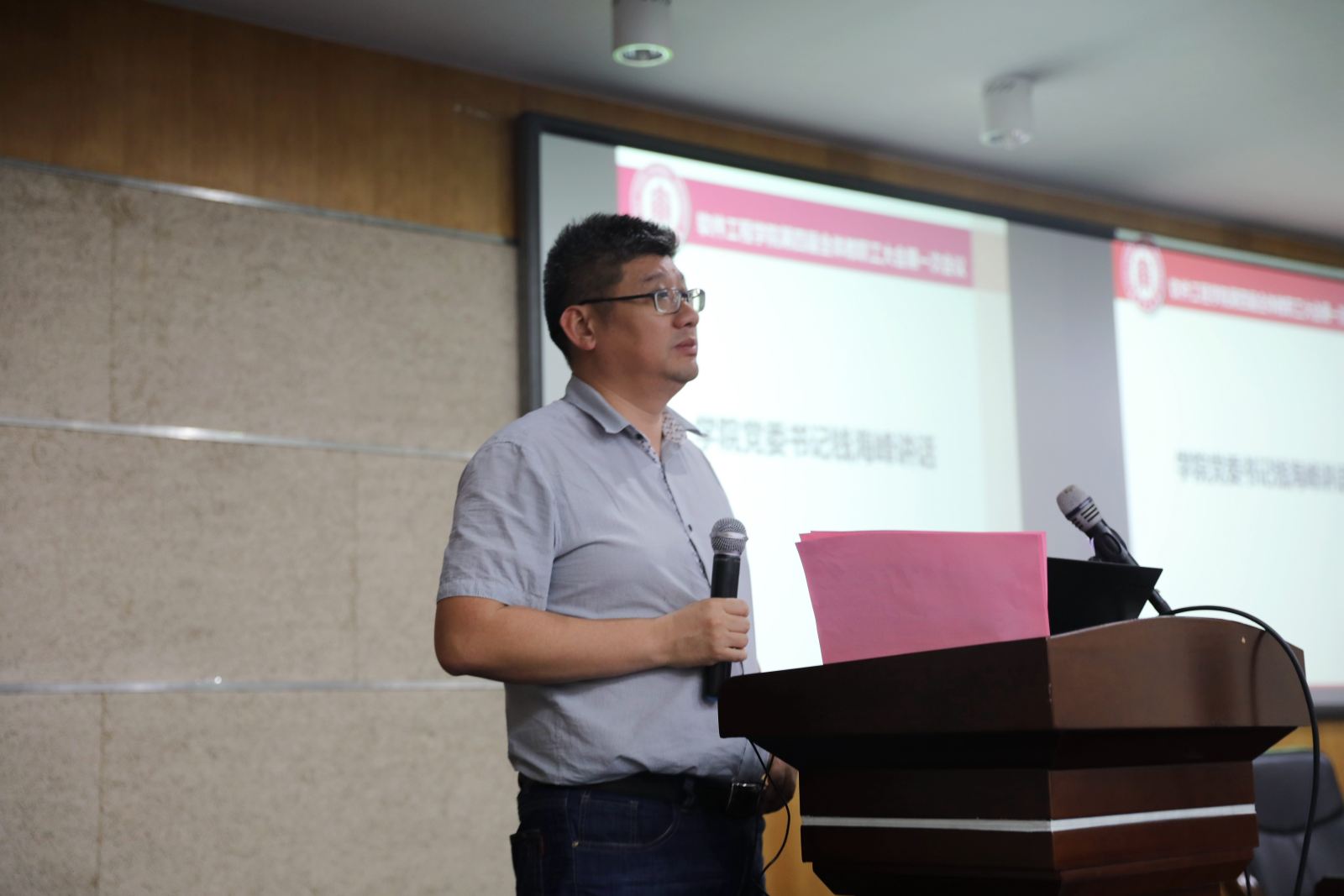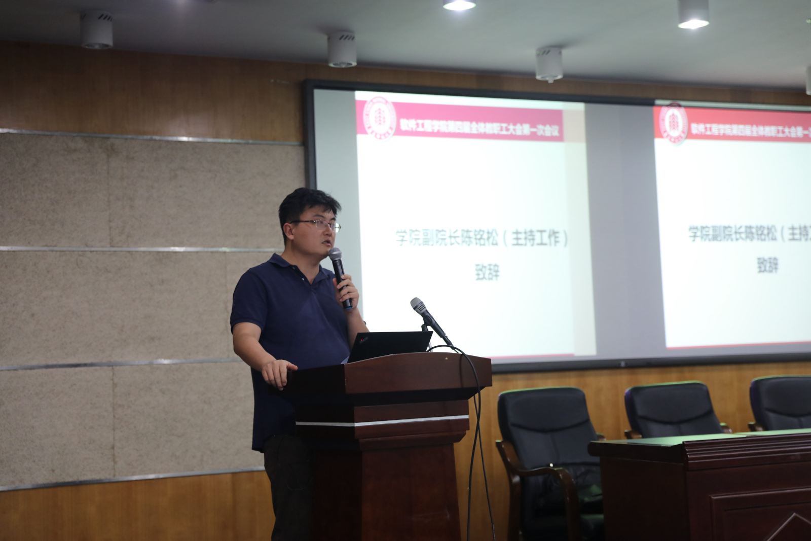 学院副院长陈铭松(主持工作)讲话。他转达了中国科学院院士、学院创院院长何积丰对学院未来整体发展的祝福与期望。自信息学部正式成立以来,学院拔锚启航,重新出发,开学工作井然有序,党建、学科、教学、科研等各项工作逐步走上正轨。同时,陈铭松教授对本次会议主要议题做简单介绍。