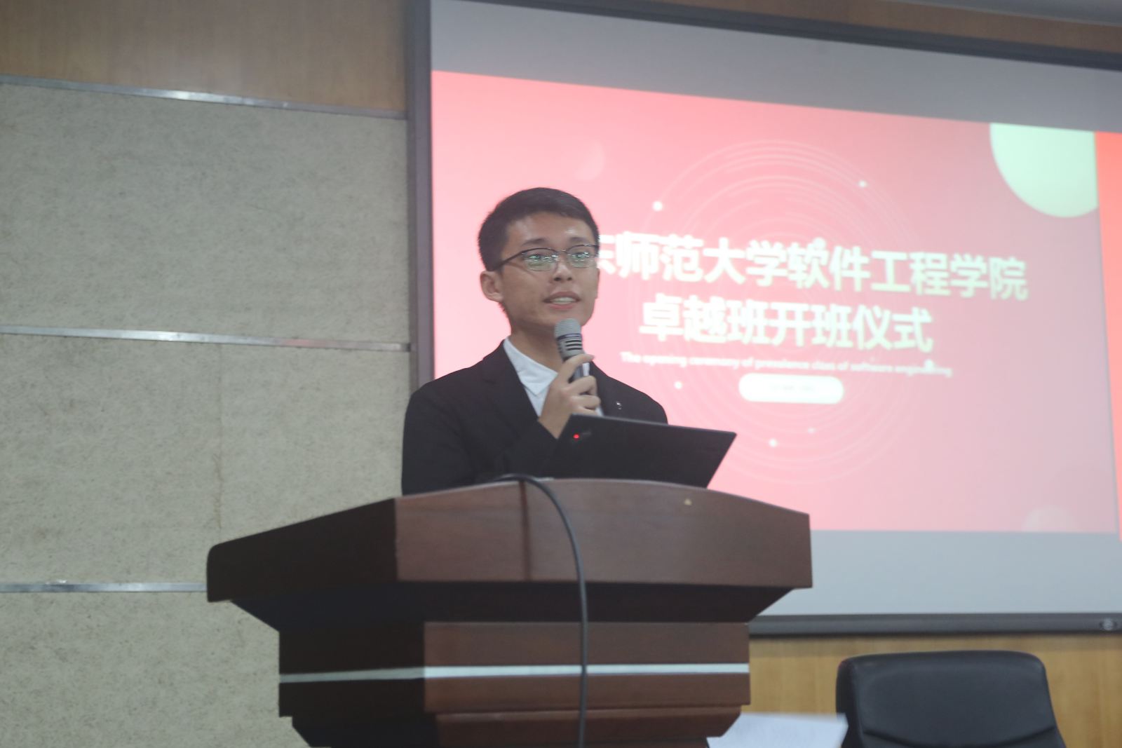 卓越班学生代表19级白东杰同学发言。他在发言中结合过去一个月在卓越班学习生活的切身体会,号召每一位卓越班同学共同砥砺前行,真正成长为具有国际视野的新型卓越人才。