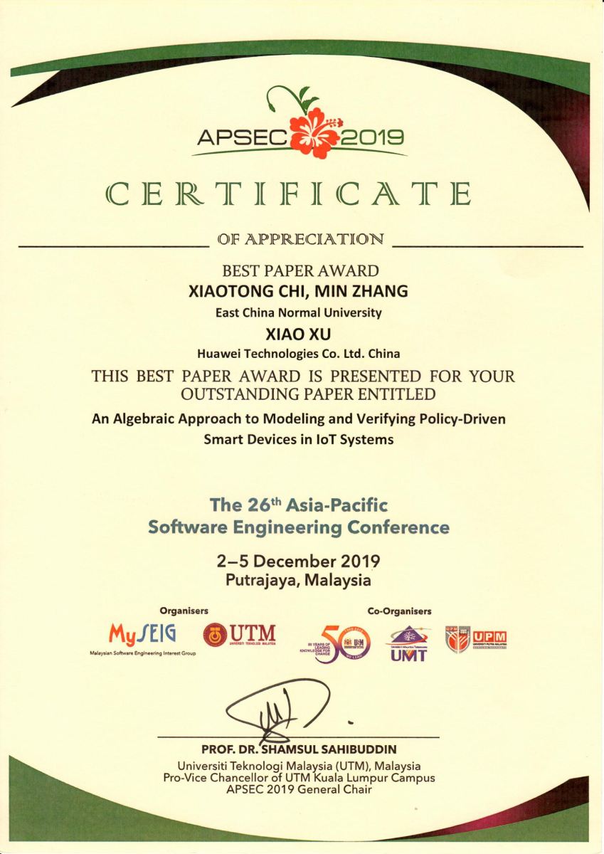 12月3日-5日,第26届亚太软件工程国际学术会议在马来西亚布城召开。bat365中文官网入口2017级专业硕士研究生迟晓彤同学以第一作者完成的论文”An Algebraic Approach to Modeling and Verifying Policy-Driven Smart Devices in IoT Systems”荣获本届会议唯一“最佳论文奖”。