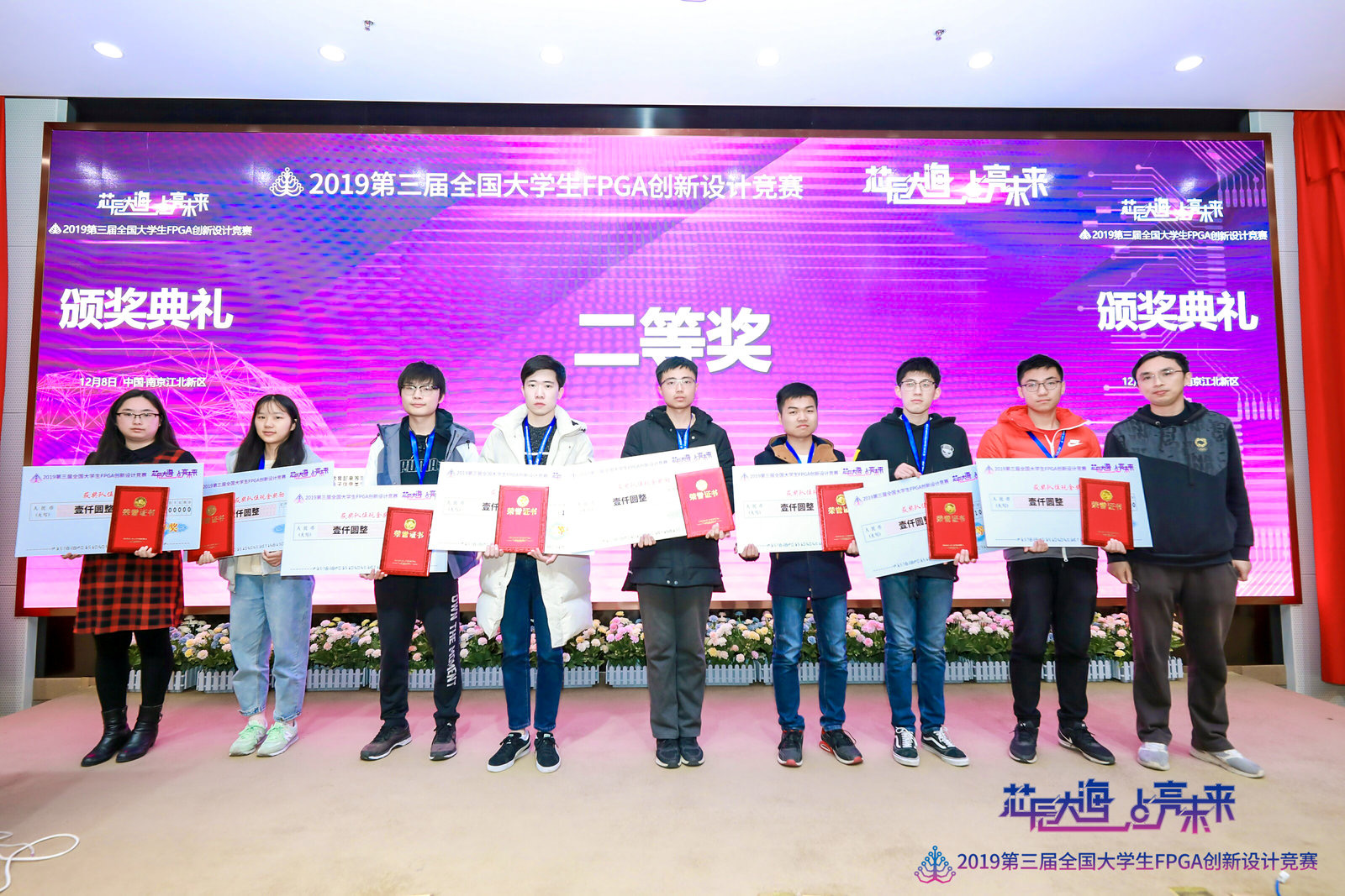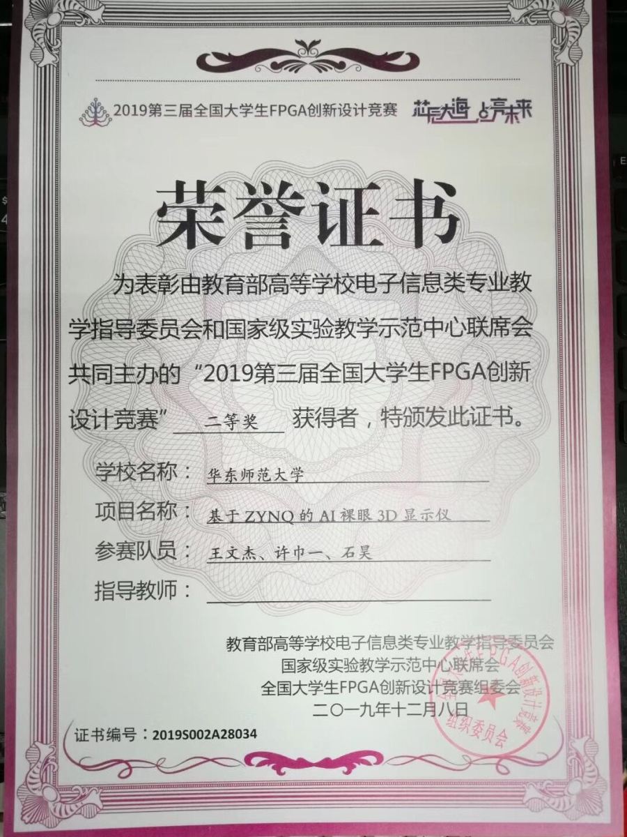 12月8日,2019第三届全国大学生FPGA创新设计竞赛复赛颁奖典礼在南京江北新区ICisC实训基地举办,bat365中文官网入口三位研究生王文杰、许巾一、石昊开发的作品《基于ZYNQ的AI裸眼3D显示仪》勇夺 二等奖!