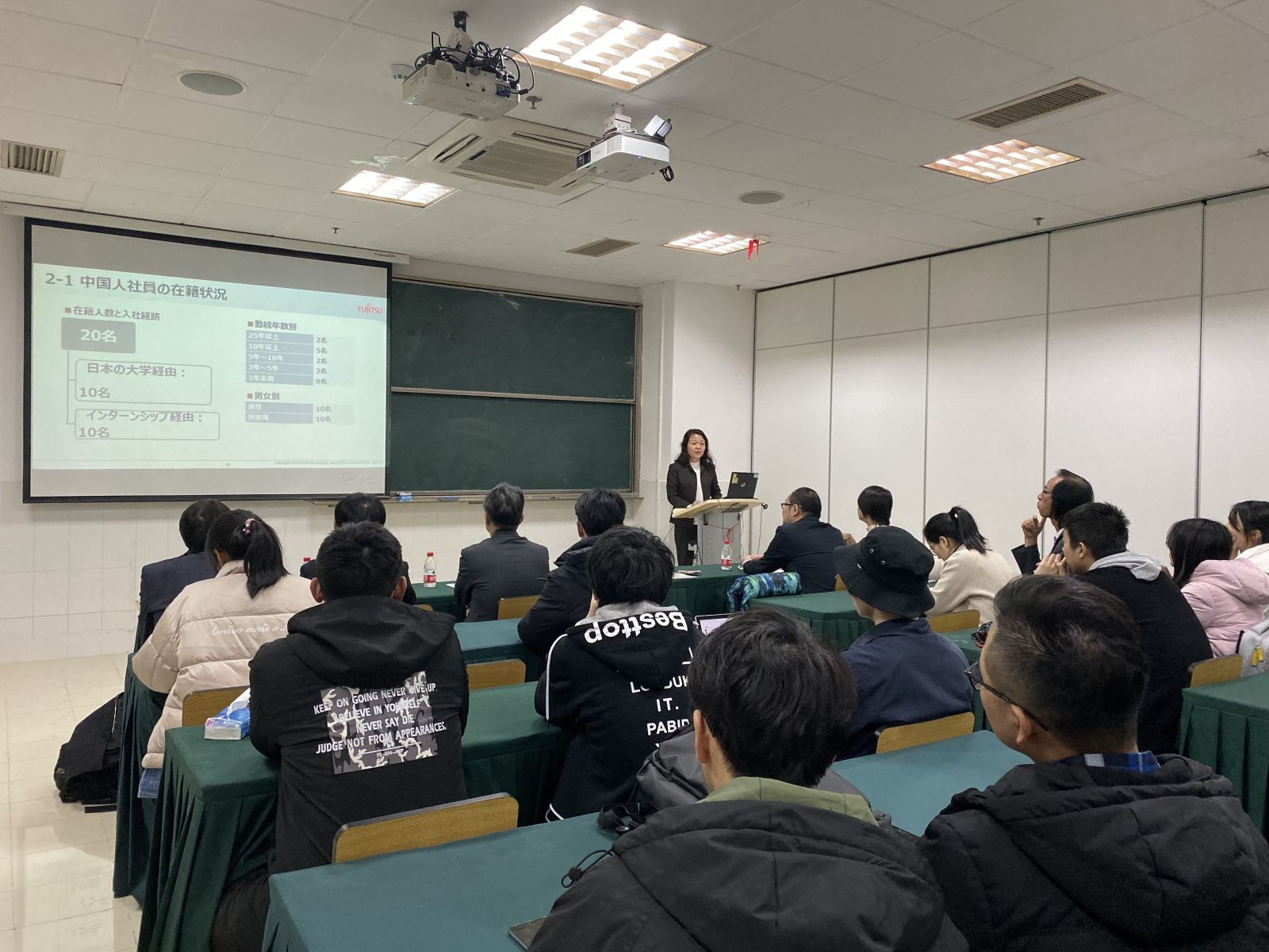 随后,富士通第三、四事业部的负责人先后介绍了他们的部门情况及有关项目,让学生们对富士通有了更加具体深入的了解。紧接着,现场播放已在富士通工作的学院往届毕业生为大家拍摄的视频,在视频中他们用流利的日语分享了在日生活和在富士通工作的经验,为大家带来了宝贵的信息。
