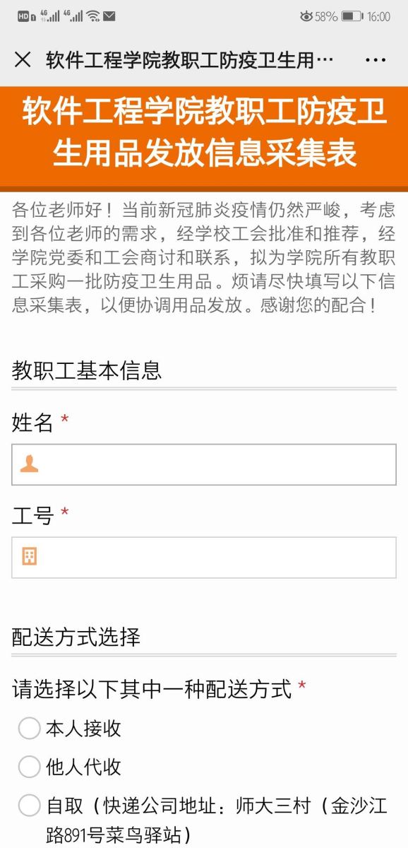 由于疫情期间不便到校领取,为及时将学院的关怀和温暖送到教职工们的手中,学院工会与物资公司、快递公司进行对接,并制作线上信息采集表,由教职工根据实际情况选择本人接收、他人代收、自取的不同配送方式。
