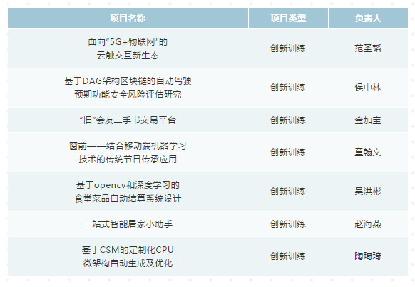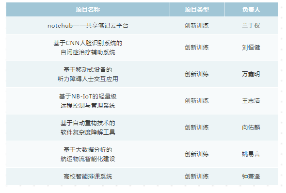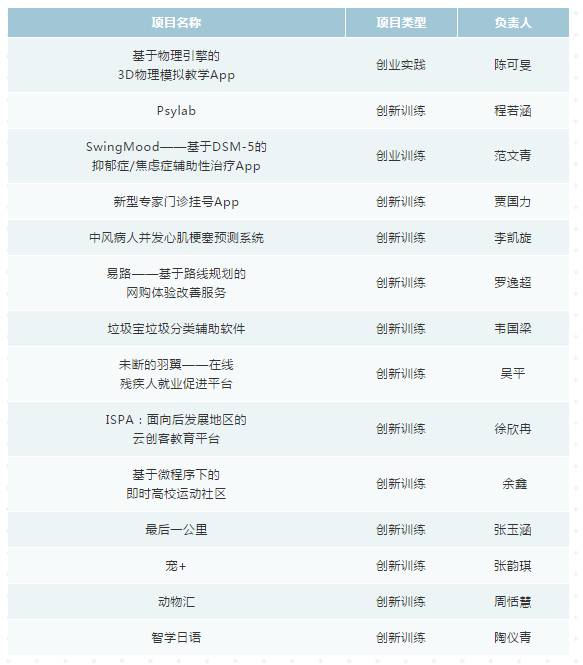 本次共有29个项目组参加了中期评审,根据项目的总体完成情况、项目的创新性以及文档的规范性共评选出国创项目7个,市创项目7个,校创项目14个,另有1项终止。公示如下(具体评定结果以教务处公布为准):