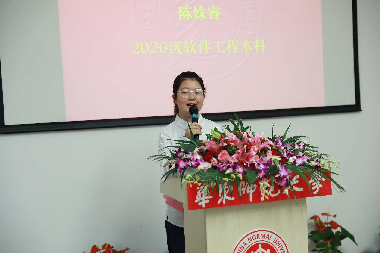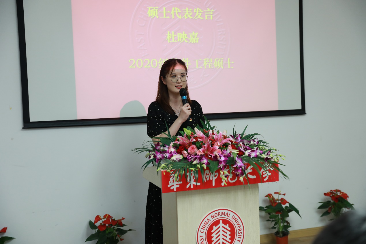 相比于初入大学的本科生,研究生同学对大学又有着一番不一样的期待。2020级硕士研究生代表杜映嘉在发言中回顾了自己曾经的四年师大时光,接着展望未来,构想着自己将要成为怎样的师大软院人:要找到自己感兴趣,能深入研究的科研方向;要耐得住寂寞,把奋斗写进三年中的每一行代码里;更要有全球视野,聚焦专业前沿。